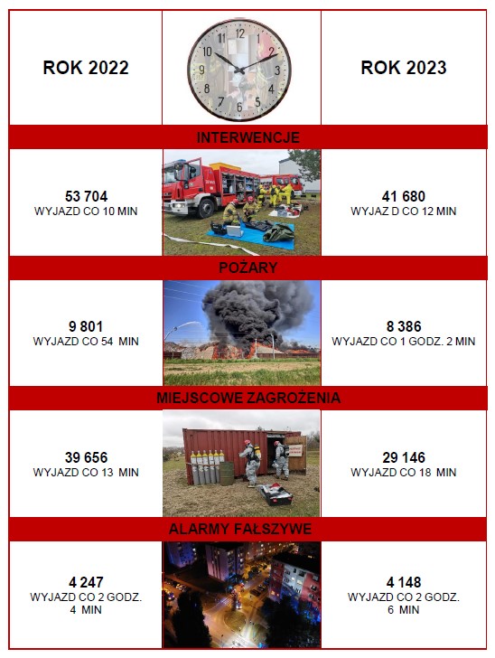 W 2023 roku strażacy odnotowali 41 680 interwencji. Jest to o 12 024 interwencje mniej niż w 2022 roku.