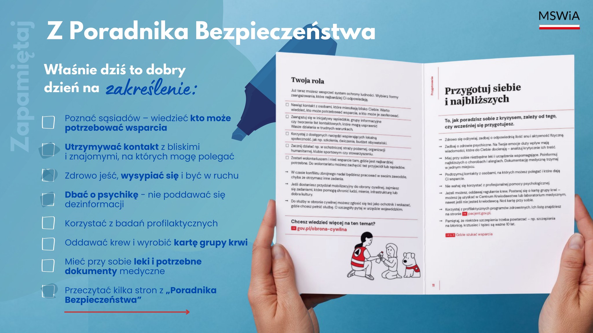 Już od dzisiaj dostępny jest „Poradnik bezpieczeństwa” , przygotowany przez Ministerstwo Obrony Narodowej, Ministerstwo Spraw Wewnętrznych i Administracji oraz Rządowe Centrum Bezpieczeństwa. Jest to publikacja, która zawiera informacje dotyczące przygotowania i postępowania w sytuacjach kryzysowych.