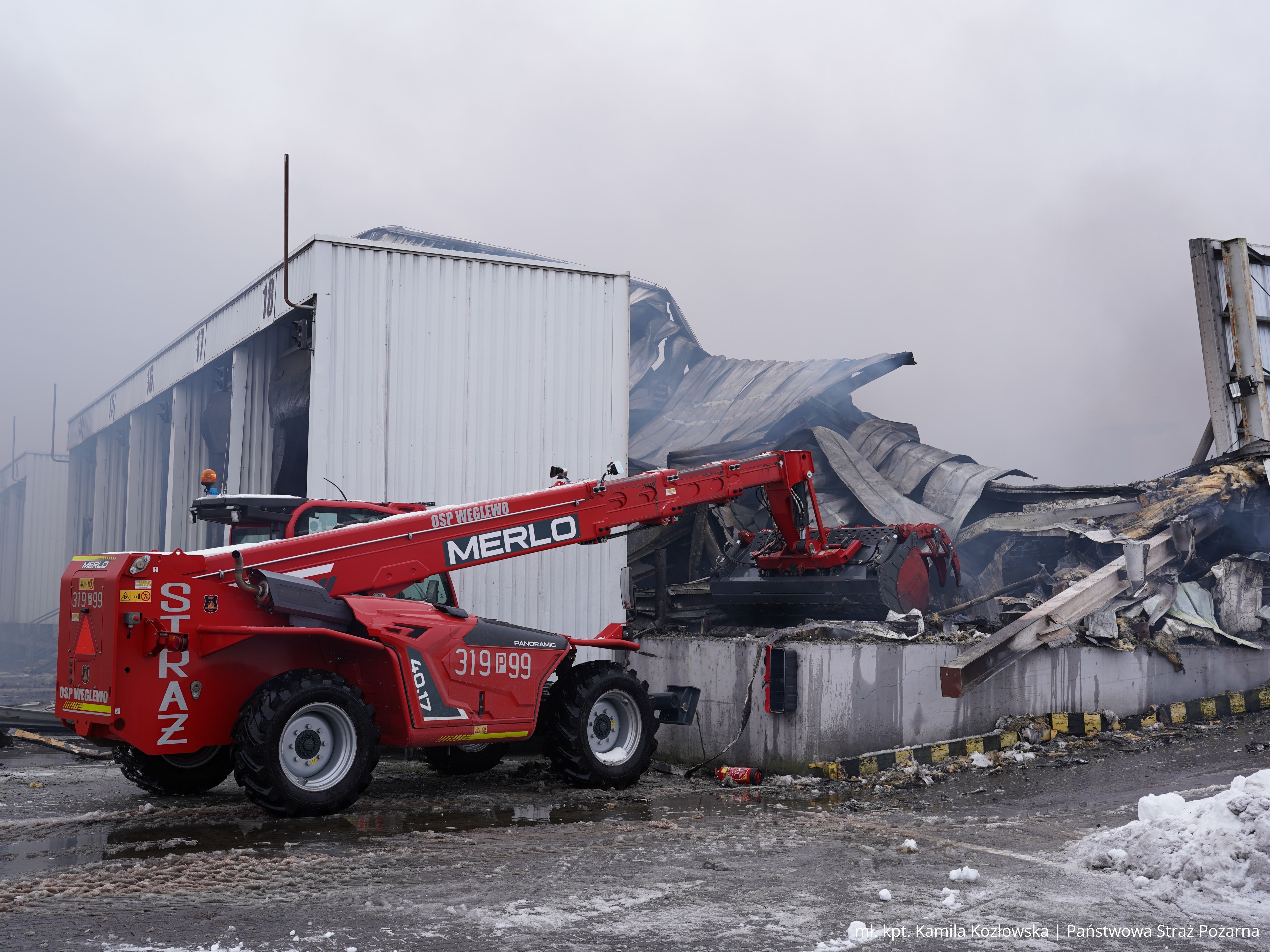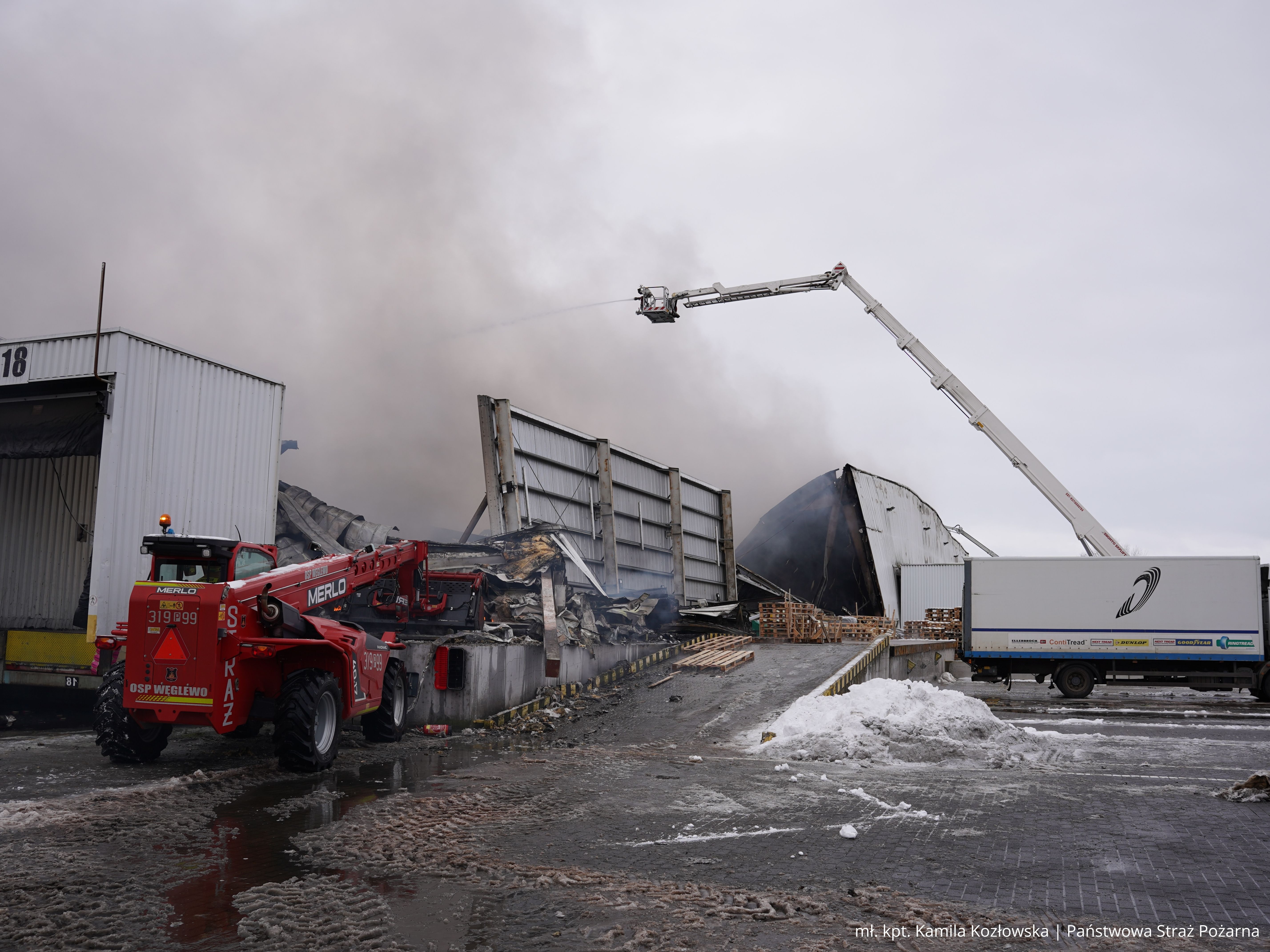 Zaopatrzenie wodne realizowano z kilku niezależnych źródeł, w tym z hydrantów, zbiornika przeciwpożarowego, cysterny oraz zbiornika naturalnego. Po opanowaniu głównej fazy pożaru do działań włączono ciężki sprzęt, który umożliwił usunięcie zawalonej konstrukcji i dotarcie do ukrytych zarzewi ognia.