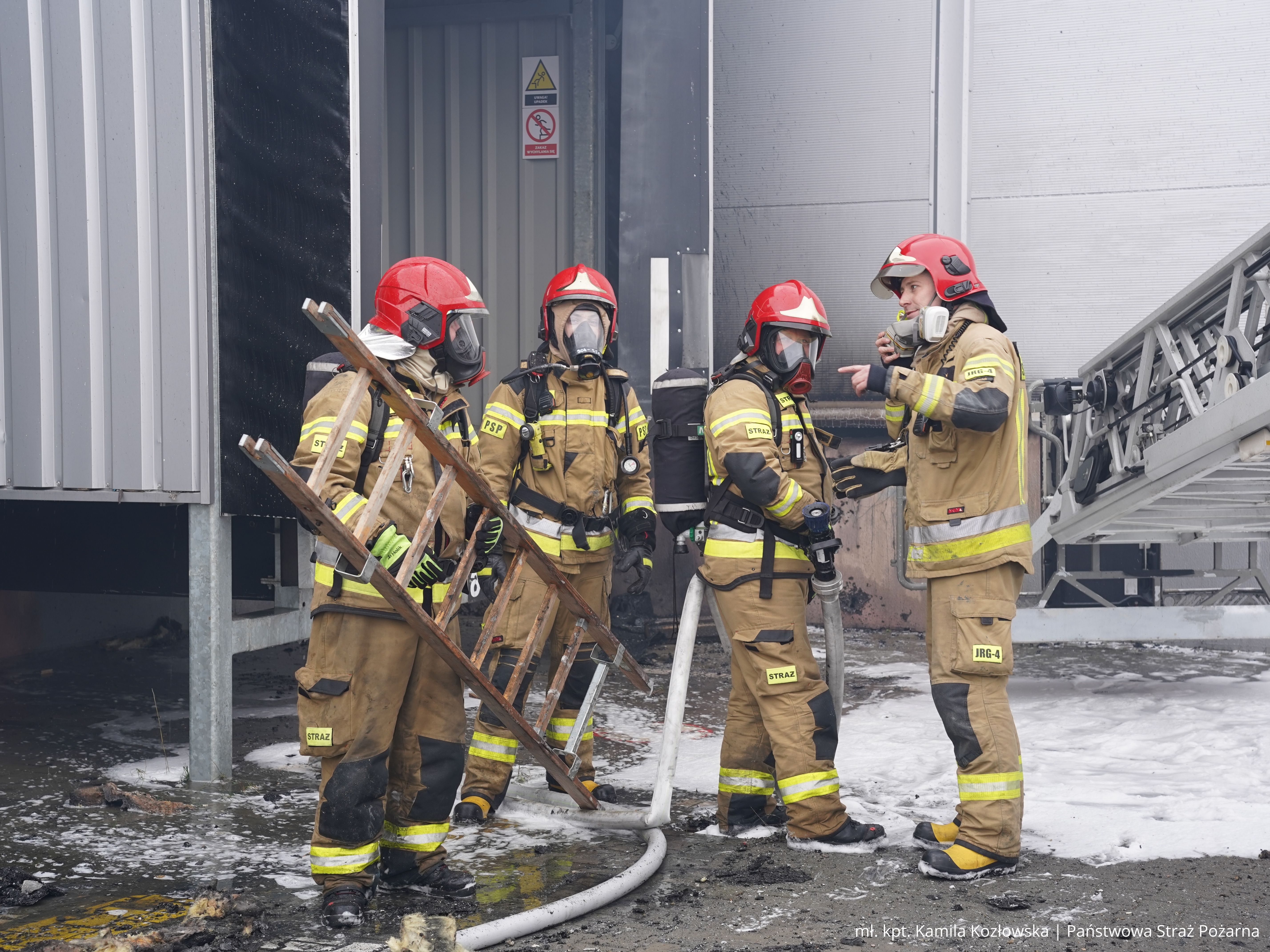 Ze względu na stalową konstrukcję hali i bardzo dużą intensywność pożaru istniało realne zagrożenie utraty stateczności obiektów. Dlatego działania prowadzone były wyłącznie z zewnątrz, z zachowaniem zasad bezpieczeństwa ratowników. Akcję dodatkowo utrudniały niekorzystne warunki atmosferyczne, w tym silny wiatr oraz ujemna temperatura, powodująca zamarzanie wody.