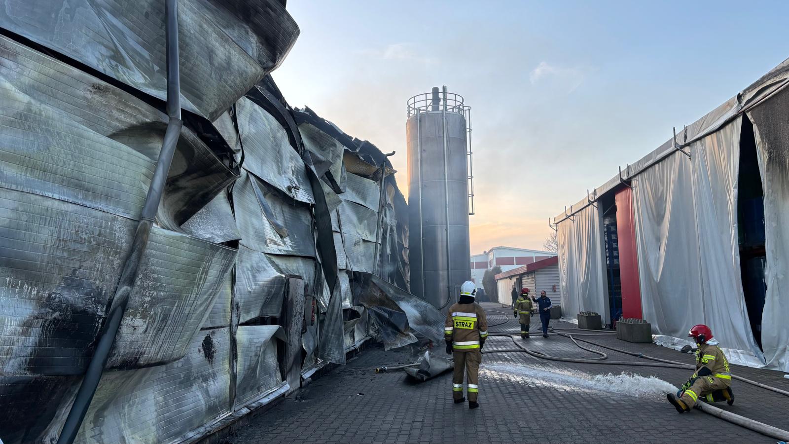 Strażacy od początku prowadzili działania dwutorowo. Z jednej strony podawali prądy wody bezpośrednio na objętą ogniem halę i wiatę, z drugiej – bronili sąsiednich budynków i infrastruktury, w tym trzech silosów z granulatem do produkcji tworzyw sztucznych. Łącznie podano osiem prądów wody – cztery w natarciu i cztery w obronie.