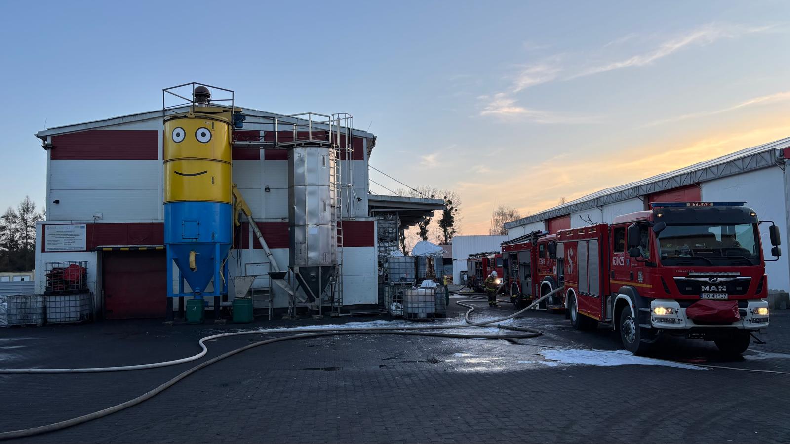 Już po kilku minutach od przybycia pierwszych zastępów było jasne, że sytuacja jest poważna. Płonęła otwarta wiata oraz część hali produkcyjnej – ogień obejmował około jedną trzecią obiektu. Nad terenem unosiły się kłęby gęstego, czarnego dymu, a z wnętrza hali dochodziły odgłosy wybuchów związane z nagromadzonymi materiałami palnymi. Na szczęście nie było informacji o osobach poszkodowanych.