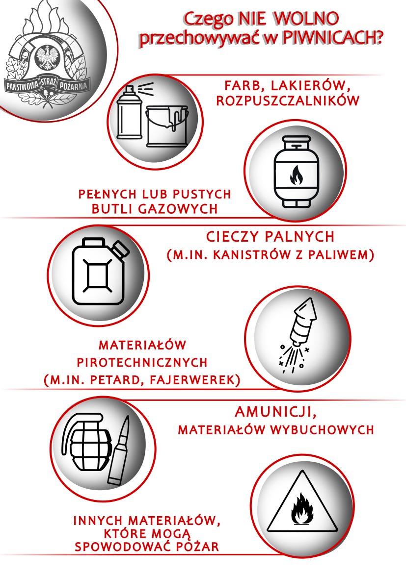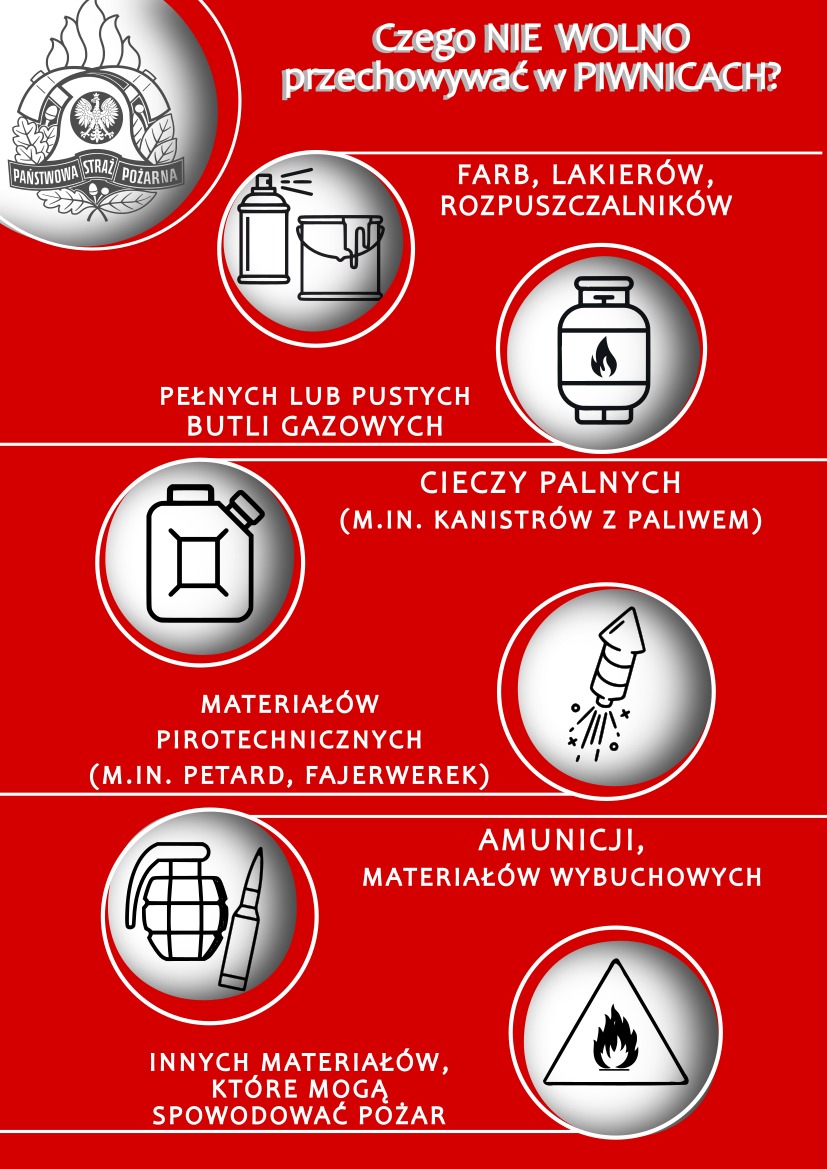 - przechowywanie łatwopalnych przedmiotów w pobliżu źródeł ciepła w piwnicach i na poddaszach budynków,