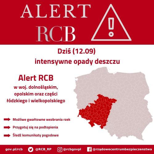"Uwaga! Dziś (12.09) intensywne, nawalne opady deszczu. Możliwe podtopienia. Nie zbliżaj się do wezbranych rzek. Słuchaj poleceń służb" - alert RCB o tej treści został wysłany do odbiorców na terenie województwa wielkopolskiego (powiaty: gnieźnieński, gostyński, jarociński, kaliski, kępiński, kolski, koniński, krotoszyński, leszczyński, ostrowski, ostrzeszowski, pleszewski, rawicki, słupecki, średzki, śremski, turecki i wrzesiński);