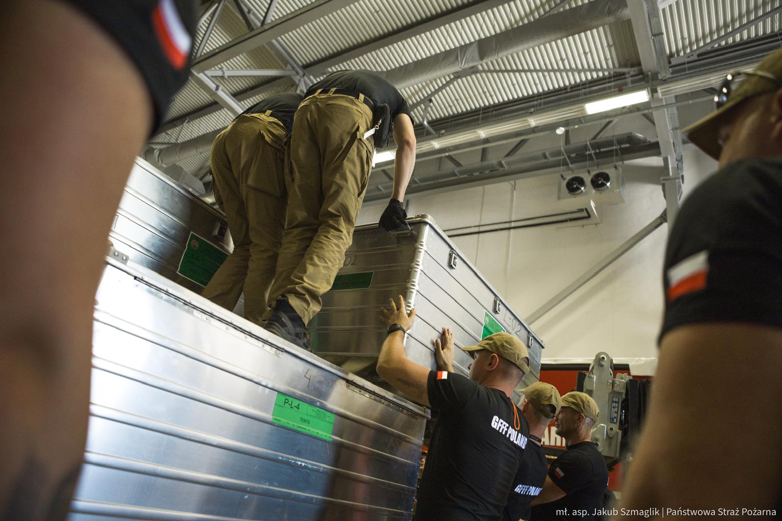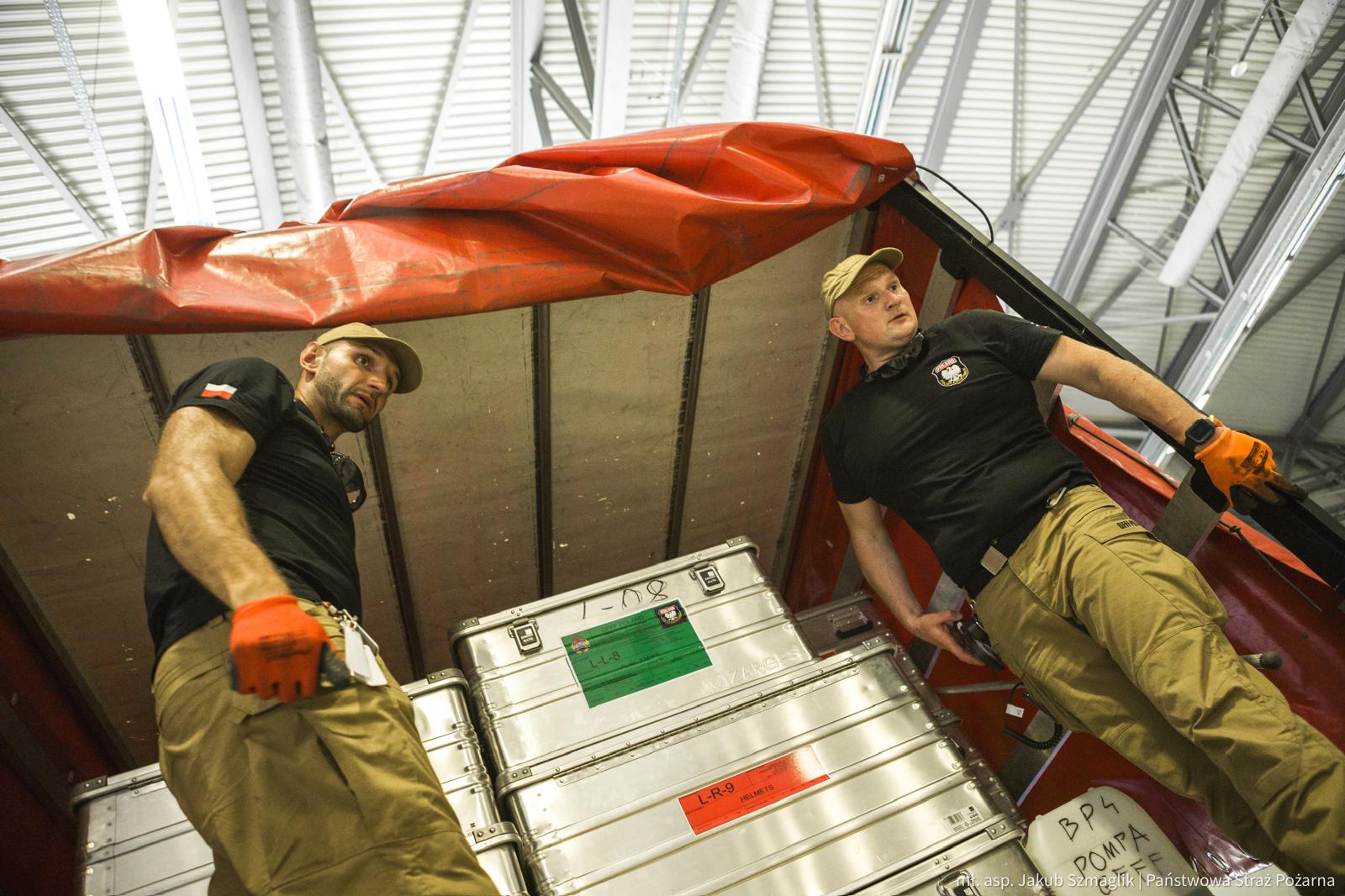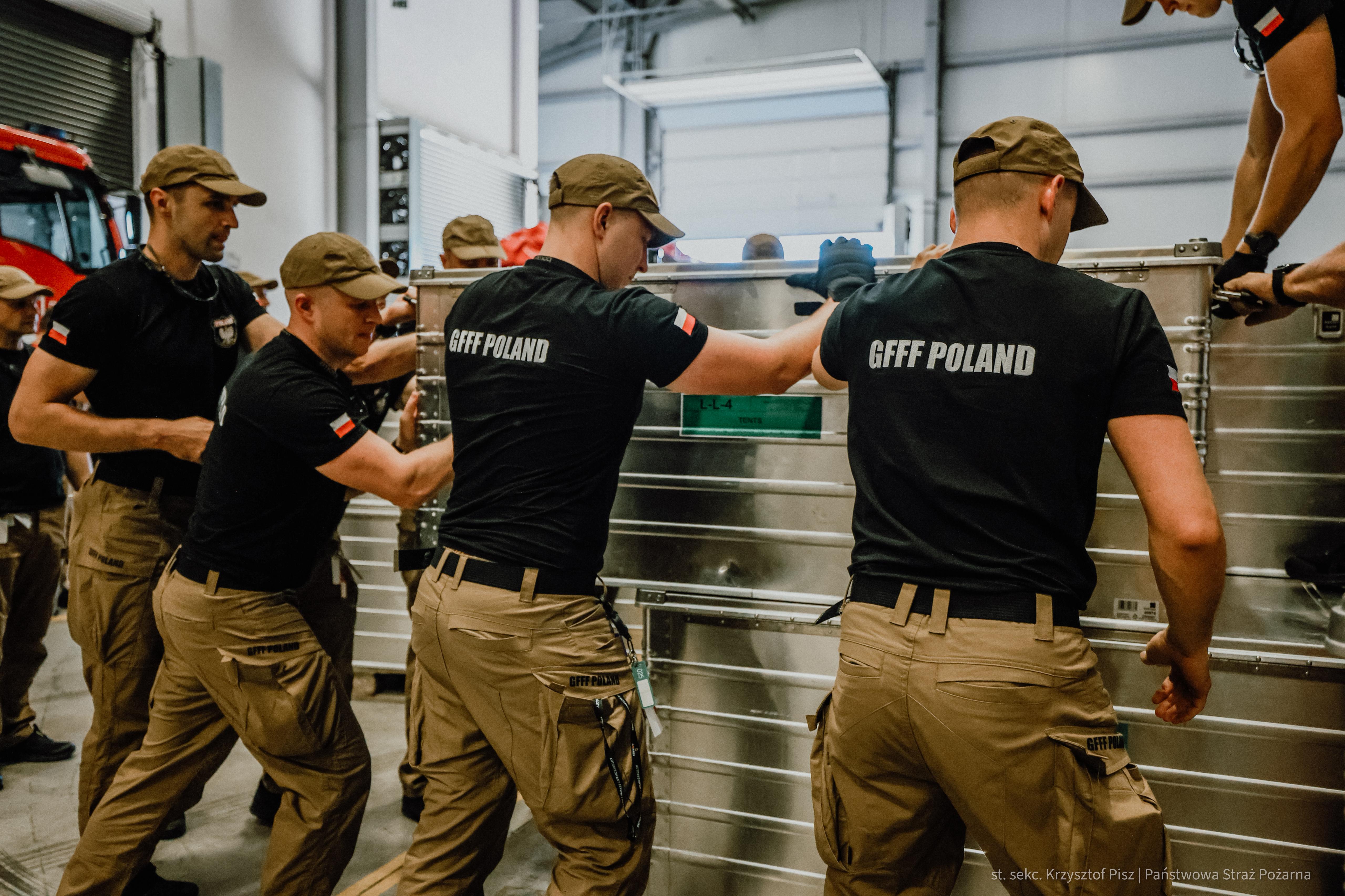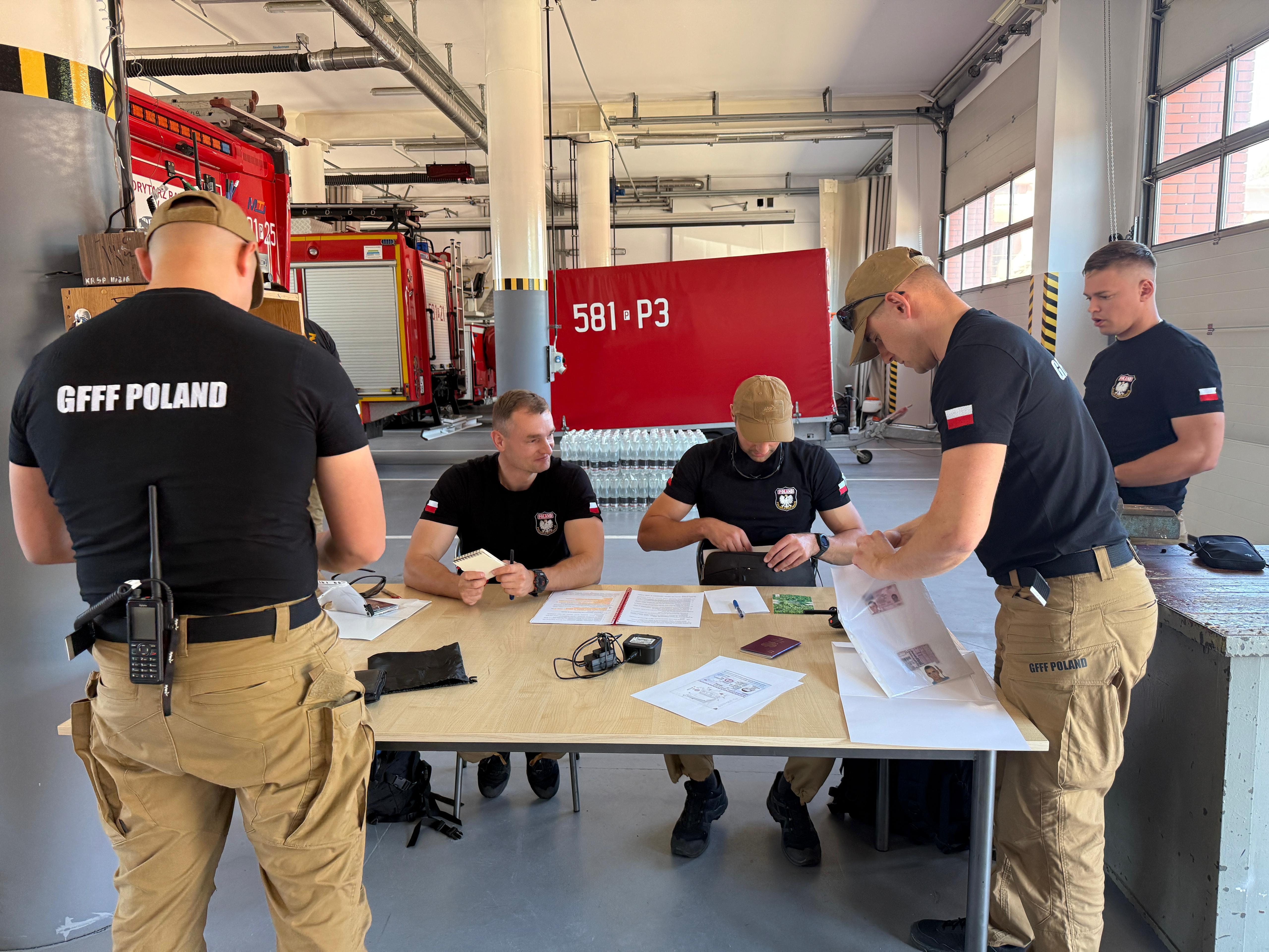 Strażacy docierają do rejonu koncentracji. Trwa odprawa, po której moduł będzie gotowy do załadowania wyposażenia na samolot transportowy będący na wyposażeniu 33. Bazy Lotnictwa Transportowego w Powidzu. Grupa ratownicza miałaby zostać przetransportowana drogą powietrzną w docelowe miejsce prowadzenia działań ratowniczych.