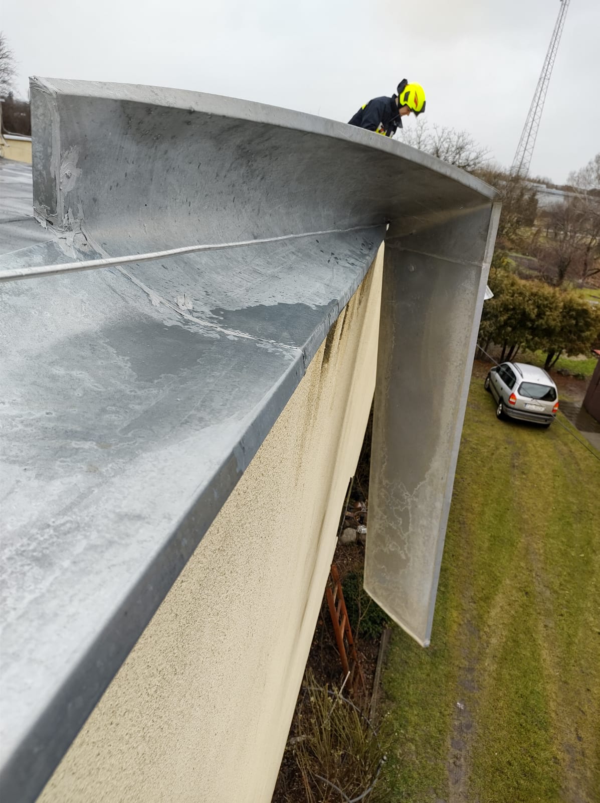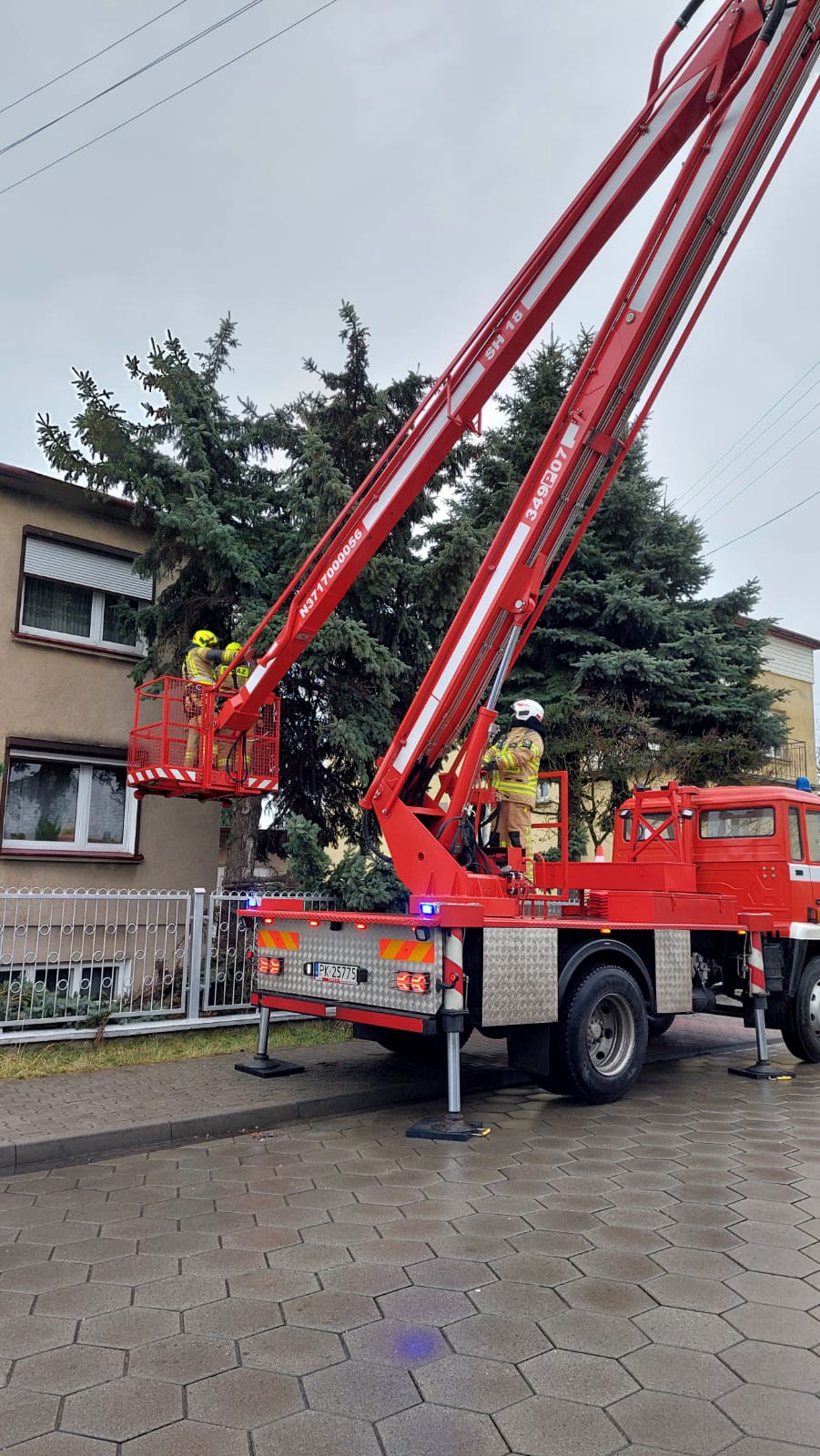 Gniezno ul. Gdańska - Młodzieżowy ośrodek socjoterapii/Szkoła - Po przybyciu na miejsce zdarzenia zastano zerwane częściowo poszycie dachu (styropapa) ok. 150 m2, które zwisało z dachu budynku wraz z uszkodzoną instalacją odgromową. Na miejscu działały 3 zastępy straży pożarnej. Szkoła nadaje się do bezpiecznego użytkowania-inspektor budowalny przybył na miejsce zdarzenia.