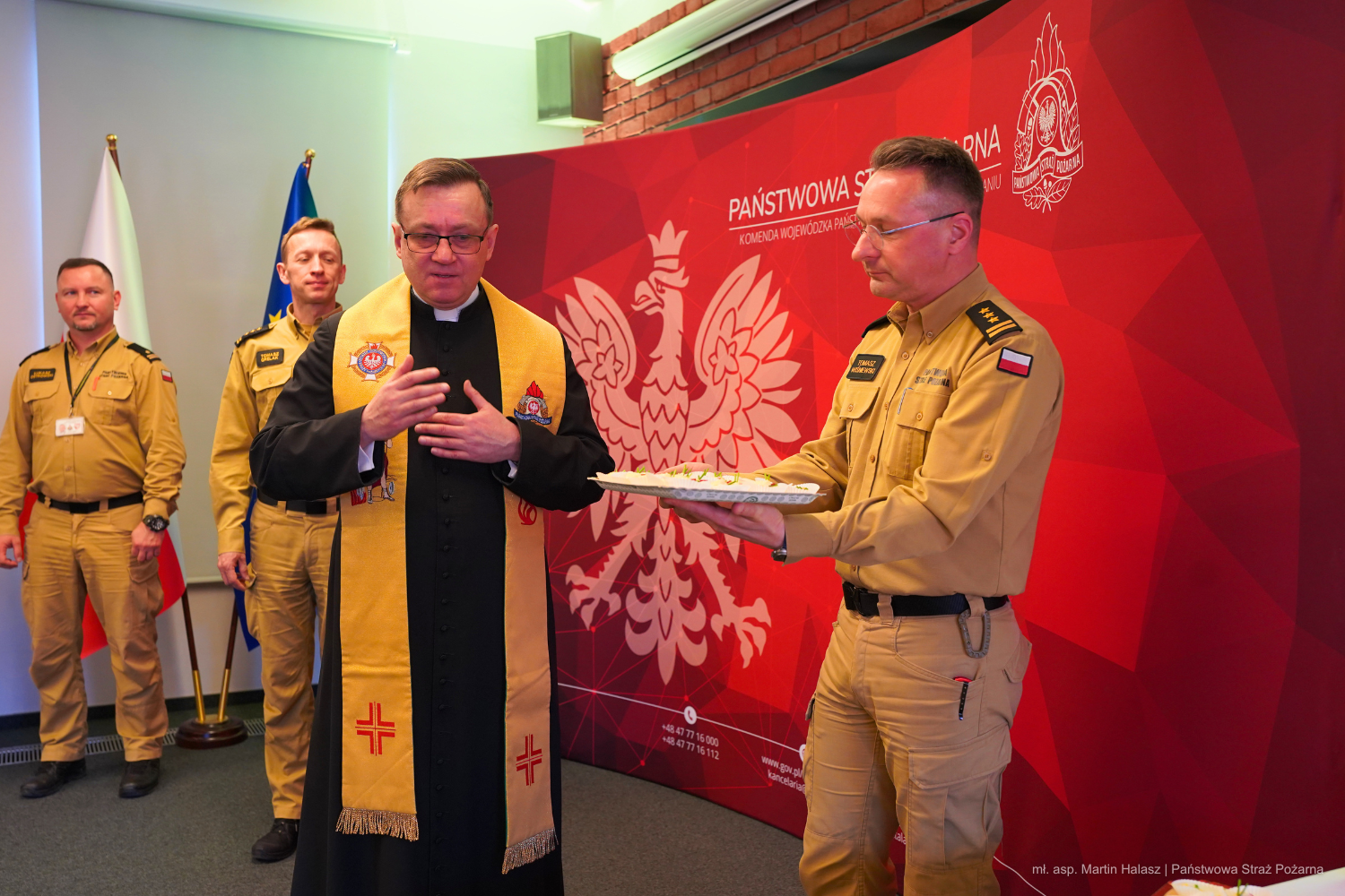 Następnie kapelan wielkopolskich strażaków ks. Mateusz Drob pobłogosławił jajka – symbol nowego życia i odradzającej się nadziei. Po modlitwie oraz błogosławieństwie Panowie Komendanci wraz z Kapelanem podzielili się poświęconymi jajkami z uczestnikami spotkania, składając sobie wzajemnie świąteczne życzenia.