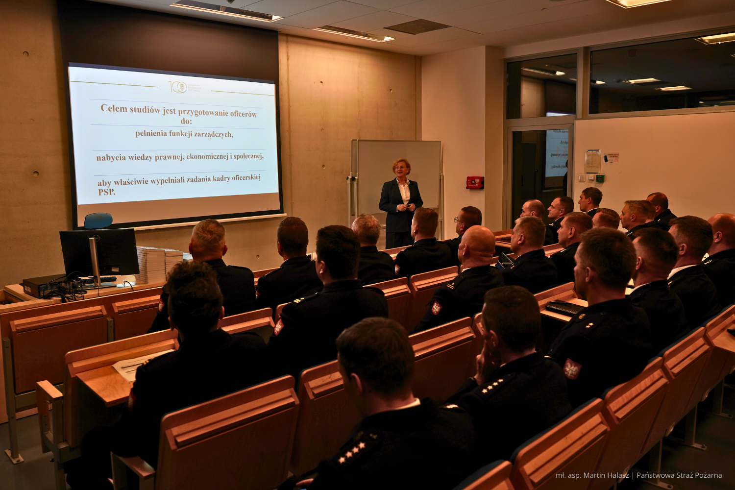 Uczestnicy rozpoczęli także pierwsze zajęcia, które wprowadziły ich w tematykę funkcjonowania administracji publicznej oraz ramy prawne zarządzania jednostką organizacyjną PSP, w szczególności problematykę racjonalnego gospodarowania finansami publicznymi. Pierwszy zjazd potwierdził zainteresowanie i zaangażowanie 30 uczestników studiów (oficerów z komendy wojewódzkiej PSP, Szkoły aspirantow PSP w Poznaniu oraz komend miejskich i powiatowych PSP), a także podkreślił wagę inwestowania w rozwój kadry PSP. Zwieńczeniem procesu kształcenia będzie opracowanie przez słuchaczy pracy dyplomowej oraz jej formalna obrona przed komisją egzaminacyjną.
