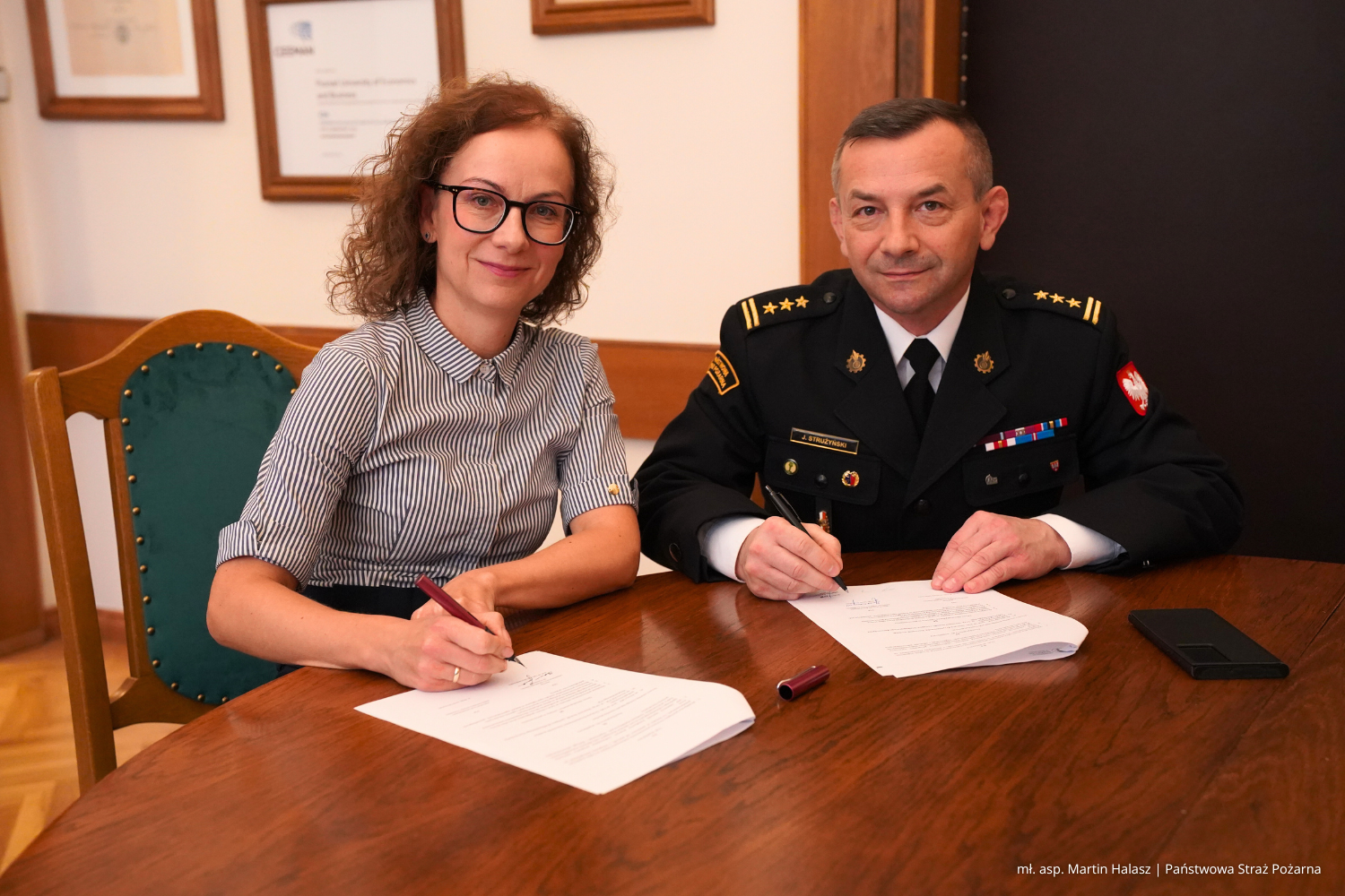 W poniedziałek 6 października 2025 r. w siedzibie Uniwersytetu Ekonomicznego w Poznaniu, st. bryg. Jacek Strużyński - Wielkopolski Komendant Wojewódzki PSP podpisał porozumienie z prof. dr hab. Barbarą Jankowską - Rektor Uniwersytetu Ekonomicznego w Poznaniu o współpracy w uruchomieniu studiów menadżerskich w zakresie Gospodarowania Zasobami, dedykowane kadrze Państwowej Straży Pożarnej.
