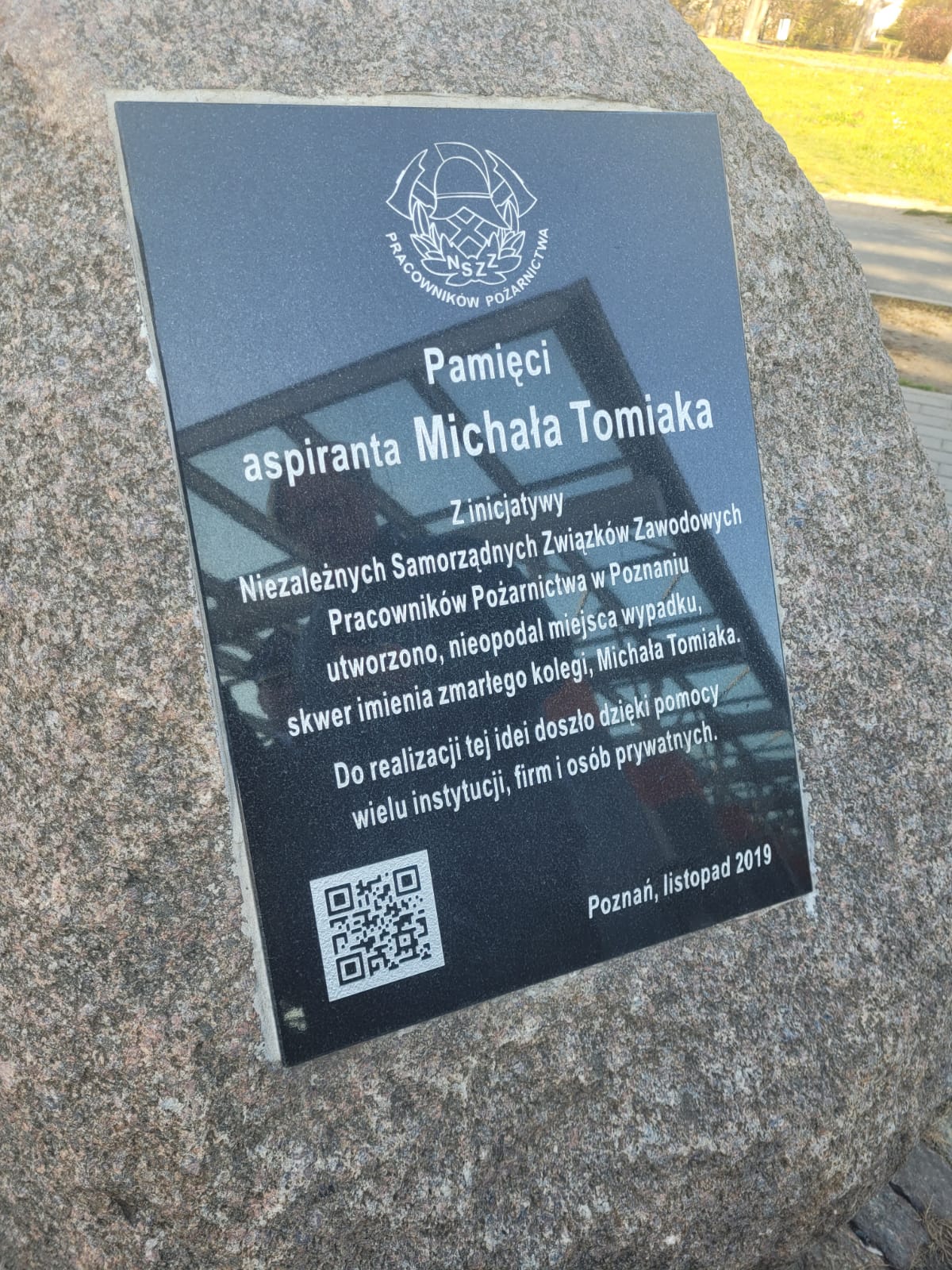 Delegacja odwiedziła również skwer im. Michała Tomiaka, strażaka z Jednostki Ratowniczo - Gaśniczej nr 7 w Poznaniu, który zginął podczas pełnienia służby właśnie w tym miejscu.