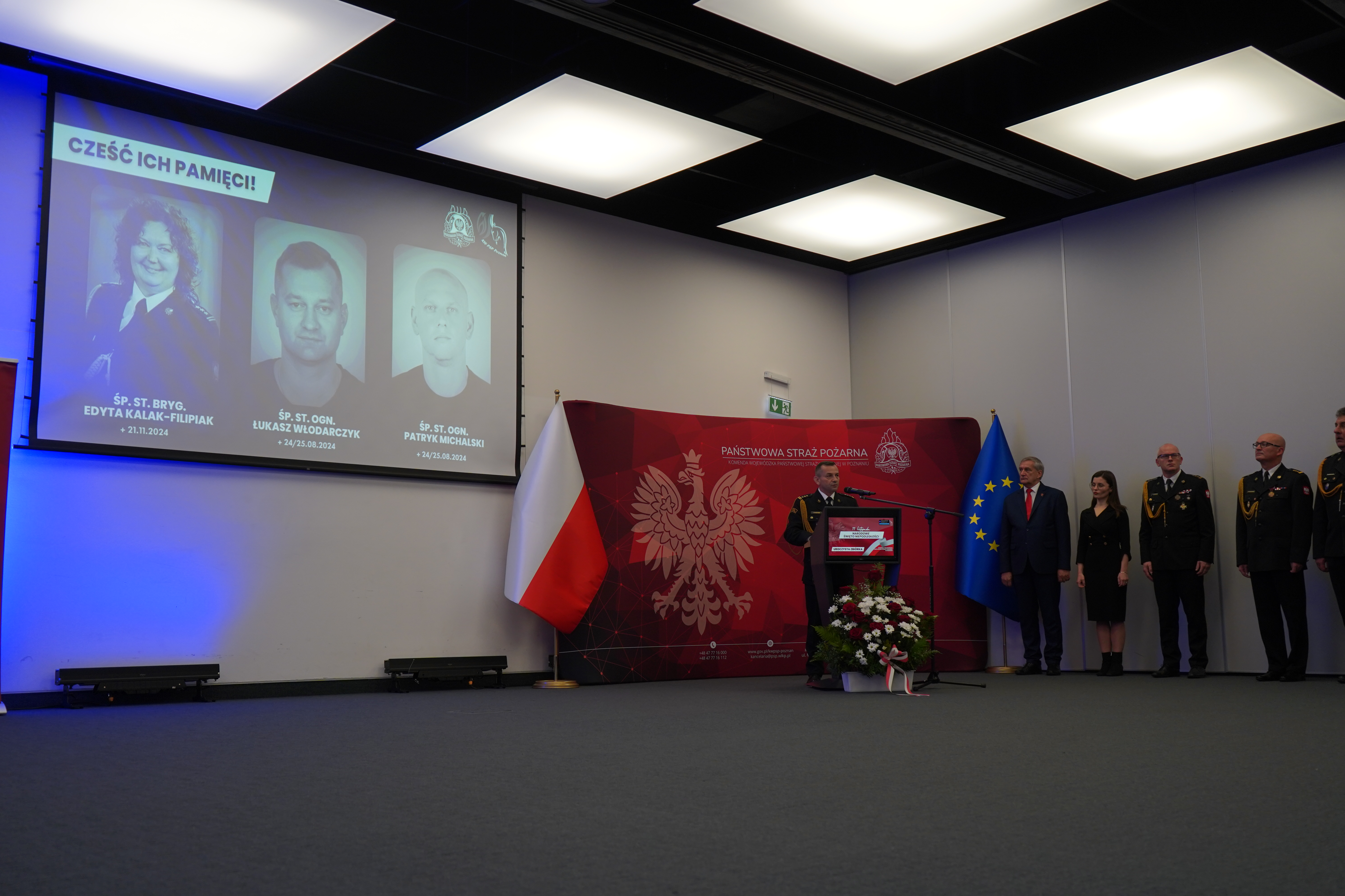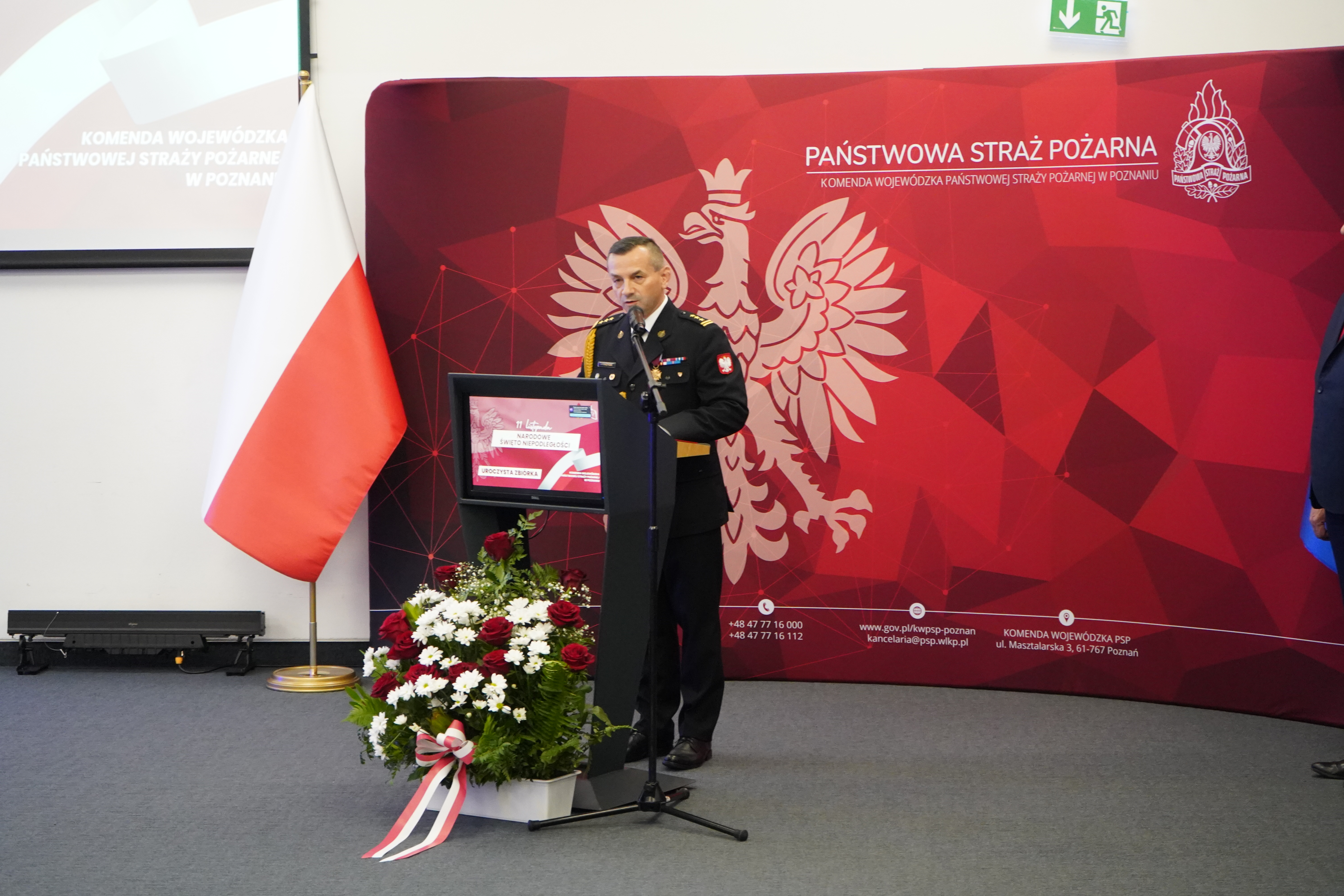 Zgromadzonych na uroczystości powitał st. bryg. Jacek Strużyński, Wielkopolski Komendant Wojewódzki PSP w Poznaniu. W swoim przemówieniu Pan Komendant zaznaczył, że dziś żyjemy w czasie pokoju, jednak strażacy podejmują walkę każdego dnia. Jest to misja na rzecz drugiego człowieka. Komendant zaznaczył również, że nie zawsze wygrywamy. W sierpniu straciliśmy dwóch naszych kolegów w pożarze kamienicy przy ul. Kraszewskiego w Poznaniu, którzy ratując życie mieszkańców ponieśli najwyższą ofiarę. Wczoraj otrzymaliśmy także informację o śmierci naszej koleżanki z Komendy Miejskiej PSP w Poznaniu, która po ciężkiej chorobie odeszła od nas. Symboliczną minutą ciszy uczczono śmierć naszej koleżanki, kolegów - strażaków, którzy odeszli.