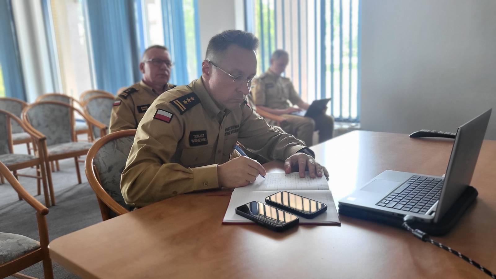 Podczas trwającej odprawy kadry kierowniczej PSP wopjewództwa wielkopolskiego odbyło się kilka wideokonferencji poświęconych podsumowaniu działań w związku z frontem burzowym, który przeszedł przez kraj w środę 19 czerwca 2024 roku.