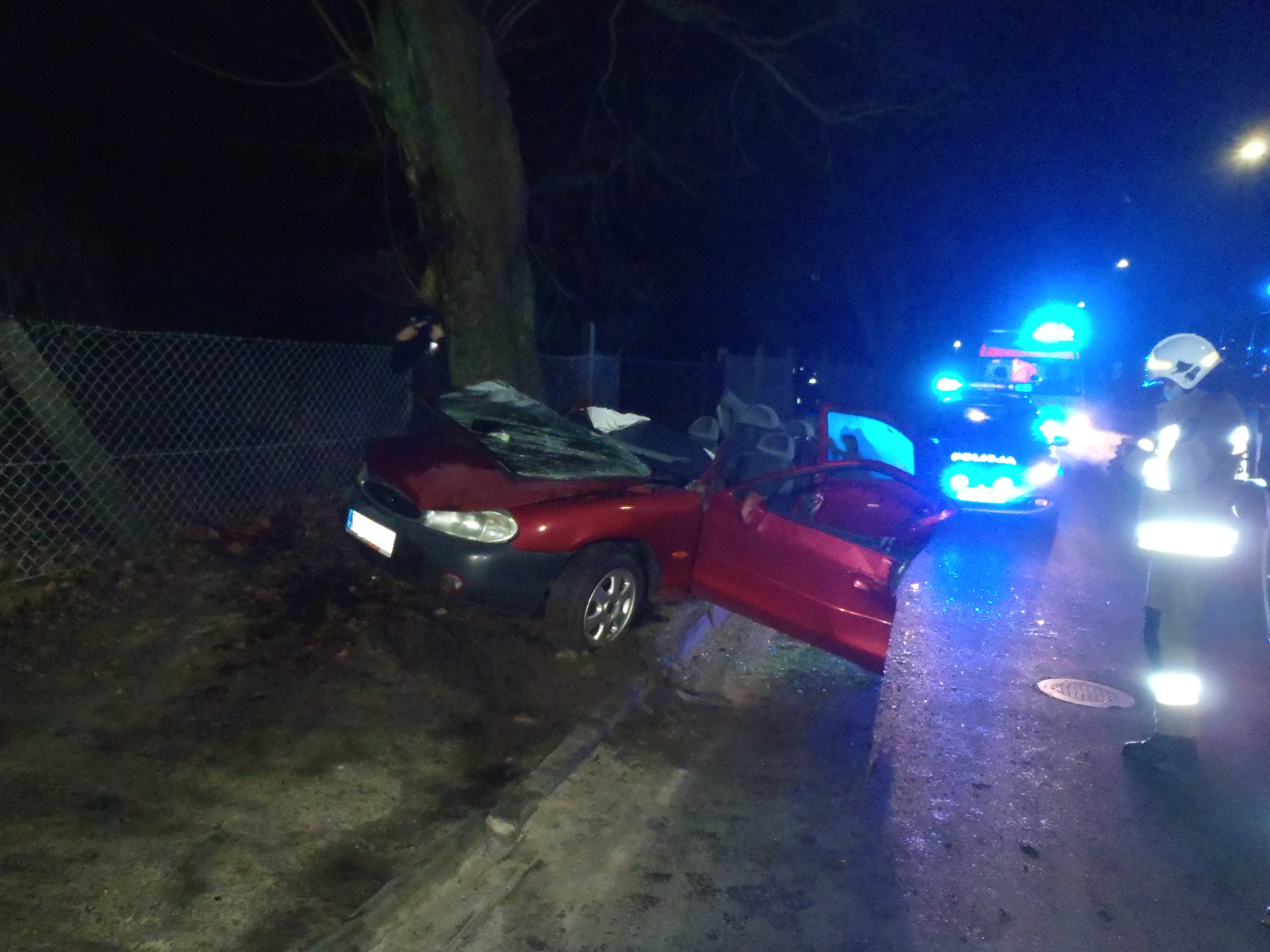 Zgłoszenie o zdarzeniu do Stanowiska Kierowania Komendanta Powiatowego PSP w Międzychodzie wpłynęło o godz. 01:09. Po dojeździe pierwszych jednostek ochrony przeciwpożarowej na miejsce zdarzenia zastano samochód, który prawym bokiem uderzył w drzewo. Dwie osoby znajdowały się wewnątrz pojazdu, były zakleszczone. Strażacy wykonali dostęp do osób poszkodowanych, a następnie przekazali je zespołowi ratownictwa medycznego. Poszkodowanych przetransportowano do szpitala.