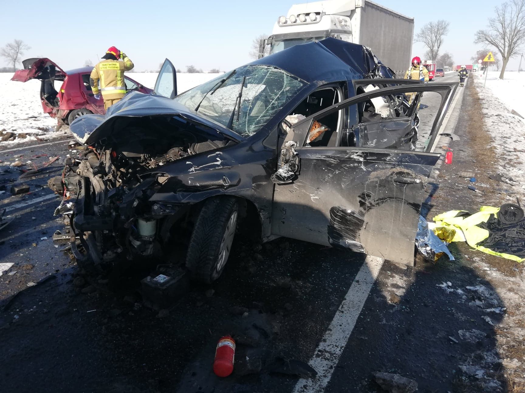 Działania straży pożarnej polegały na zabezpieczeniu miejsca zdarzenia, następnie strażacy wykonali dostęp do uczestników zdarzenia i wspólnie z ratownikami medycznymi przystąpili do ich ewakuacji na noszach typu deska do będących na miejscu karetek pogotowia. Trzy osoby spośród czterech poszkodowanych wymagały przewiezienia do Szpitalnego Oddziału Ratunkowego. Po przekazaniu osób poszkodowanych pod opiekę ZRM strażacy w rozbitych pojazdach odłączyli akumulatory i zabezpieczyli wycieki płynów technicznych. Po zakończonych czynnościach realizowanych przez grupę dochodzeniową z Policji uszkodzone pojazdy zostały zabrane przez pomoc drogową, a z jezdni zostały usunięte elementy karoserii samochodowej oraz wycieki płynów technicznych.