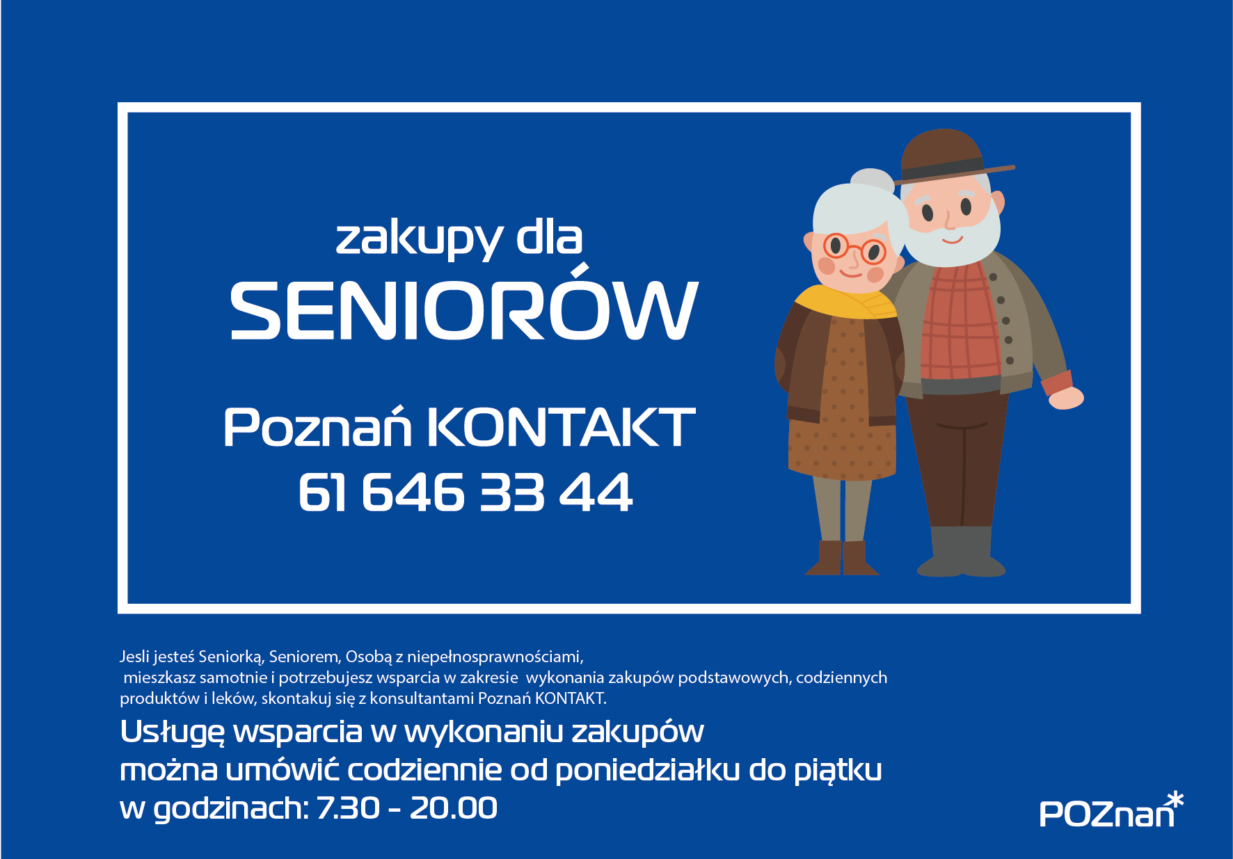 Akcja "Zakupy dla seniorów" ma chronić przed koniecznością wychodzenia z domów osoby starsze i osoby z niepełnosprawnościami, które mieszkają w Poznaniu. Mogą z niej skorzystać poznaniacy i poznanianki powyżej 60. roku życia, którzy samotnie prowadzą gospodarstwo domowe lub mieszkają z drugą osobą z niepełnosprawnościami, długotrwale chorą lub niesamodzielną. Zakupy dostarczone zostaną również do mieszkania osoby z niepełnosprawnością, która ukończyła 18 lat, mieszka w Poznaniu i samotnie prowadzi gospodarstwo domowe.