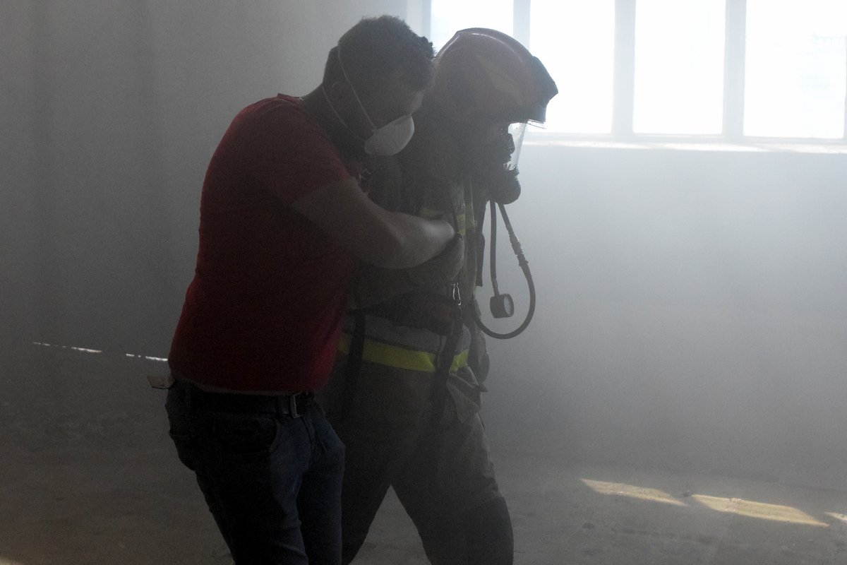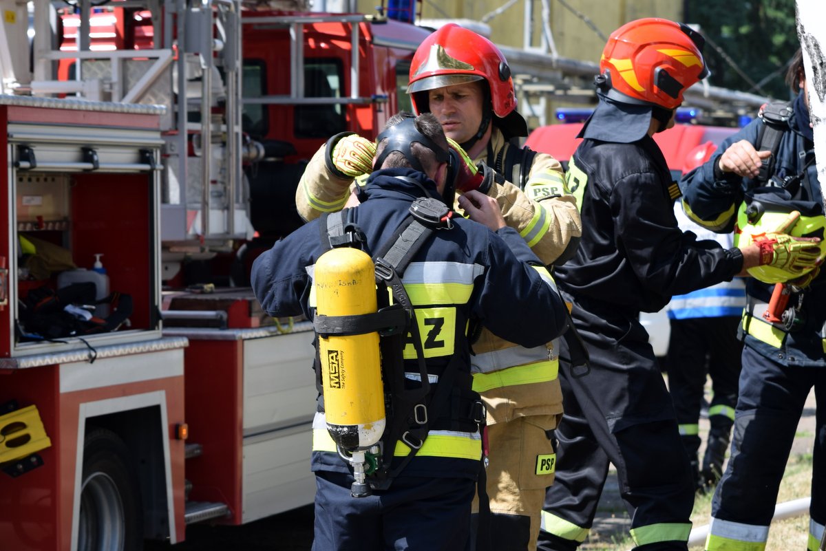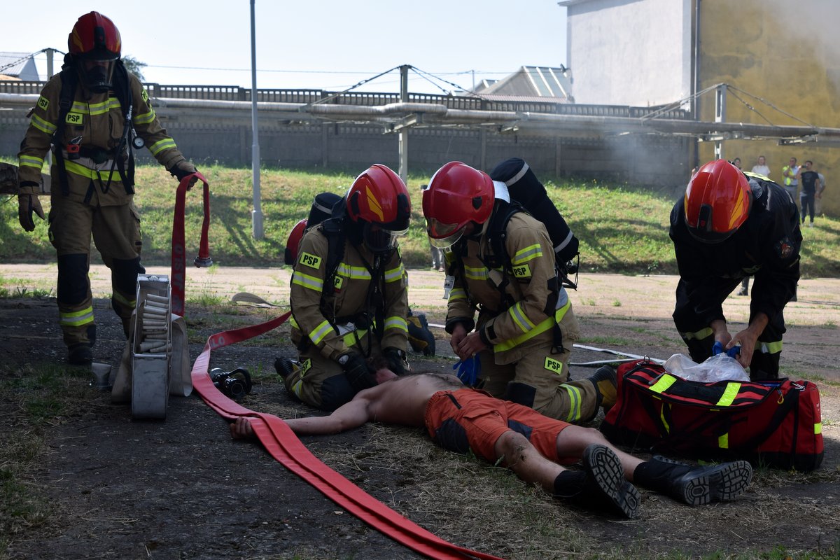 - gaszenia pożaru obiektu biurowo-magazynowego – taktyka działań gaśniczych przy pożarach wewnętrznych, zapewnienie ciągłości podawania środków gaśniczych, udzielanie kwalifikowanej pierwszej pomocy medycznej;