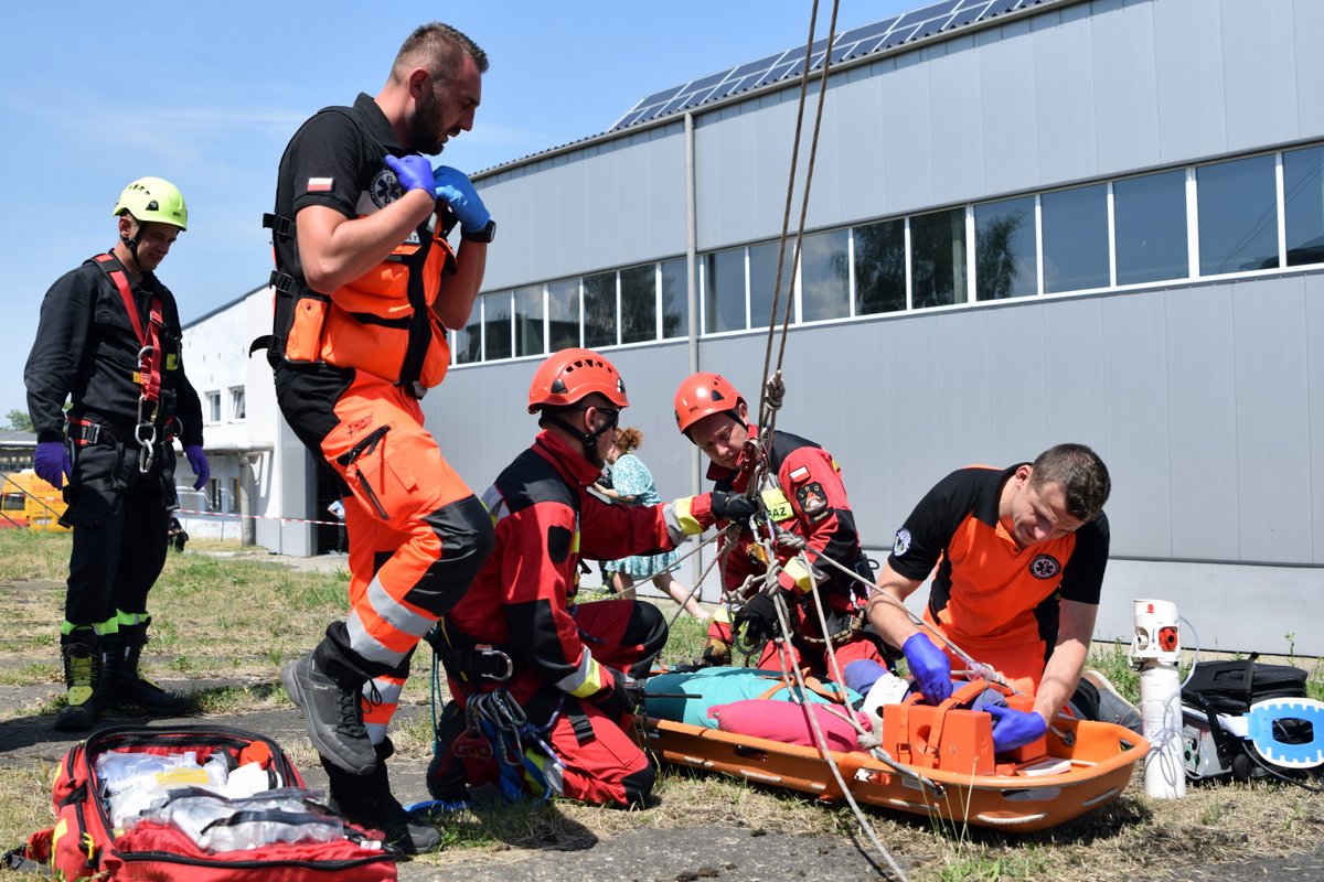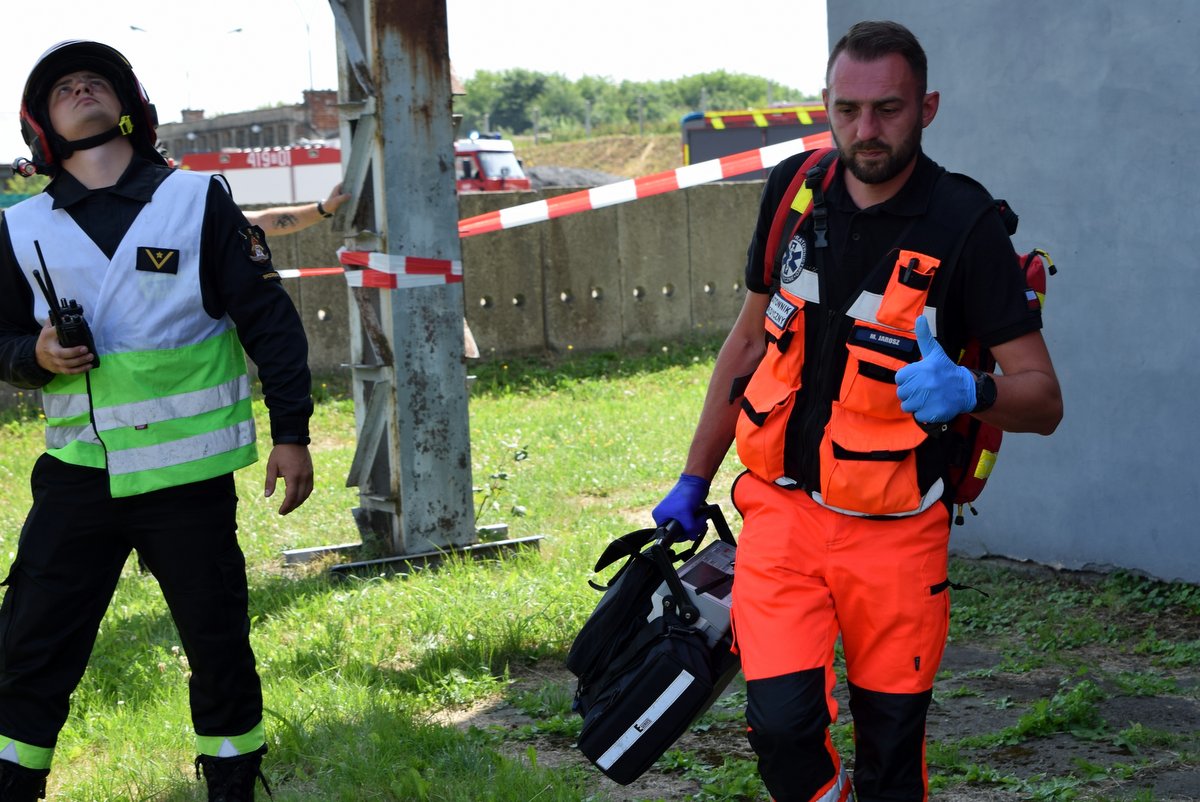 Podczas cotygodniowego sprawdzenia stanu technicznego komina ciepłowniczego, na skutek wysiłku oraz upału dochodzi do zasłabnięcia i upadku pracownika z drabinki technicznej na podest komina usytuowany na wysokości ok. 20 m. W wyniku zdarzenia pracownik doznał złamania kości udowej. Poszkodowany odczuwa silny ból, jest w szoku, co utrudnia kontakt z mężczyzną. Pracownik nie jest w stanie o własnych siłach opuścić podestu.