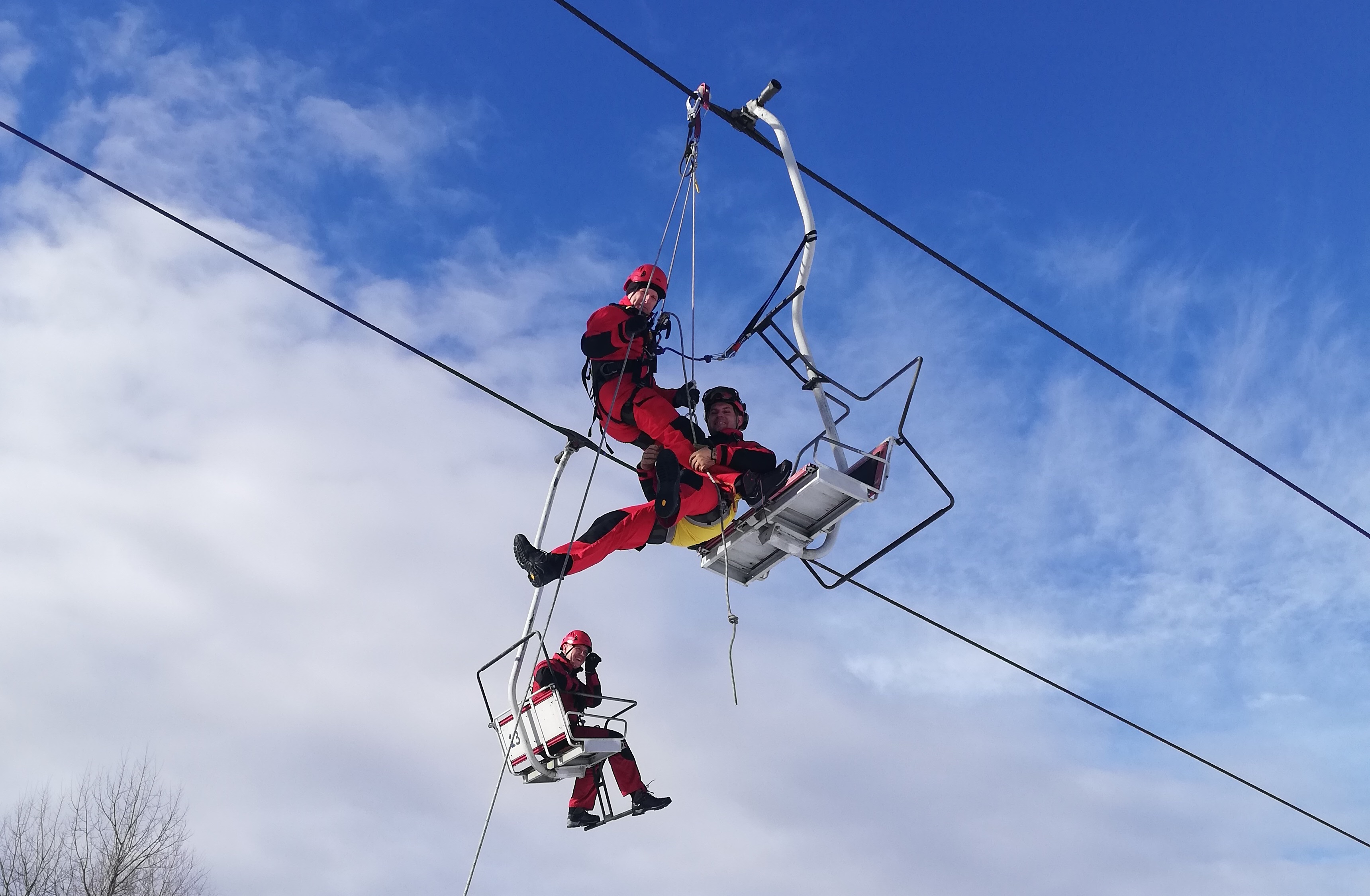 Ćwiczenia realizowane na dolnej stacji stoku narciarskiego miały na celu praktyczne przeprowadzenie ewakuacji kolei linowej na wypadek awarii wyciągu.