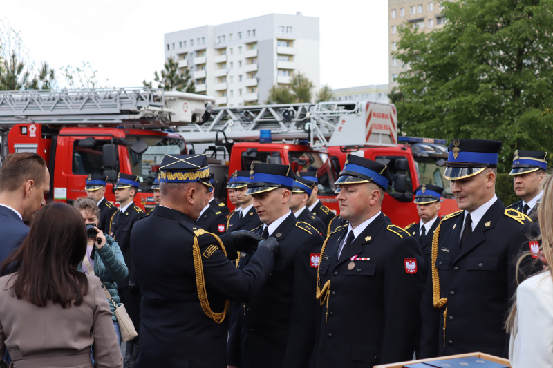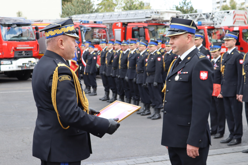 Uroczysty apel był okazją do wręczenia awansów na wyższe stopnie służbowe, medali i odznaczeń dla zasłużonych strażaków.