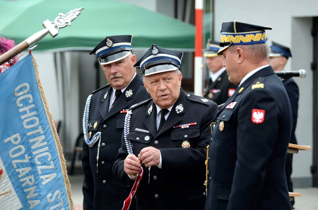 Zdjęcie zrobione na zewnątrz, podczas uroczystości. W szeregu stoi 3 strażaków, dwóch z nich to strażacy ochotnicy. Trzeci, to oficer Państwowej Straży Pożarnej w stopniu generała. Strażacy ubrani są w mundury wyjściowe ze sznurami galowymi. Strażacy salutują.