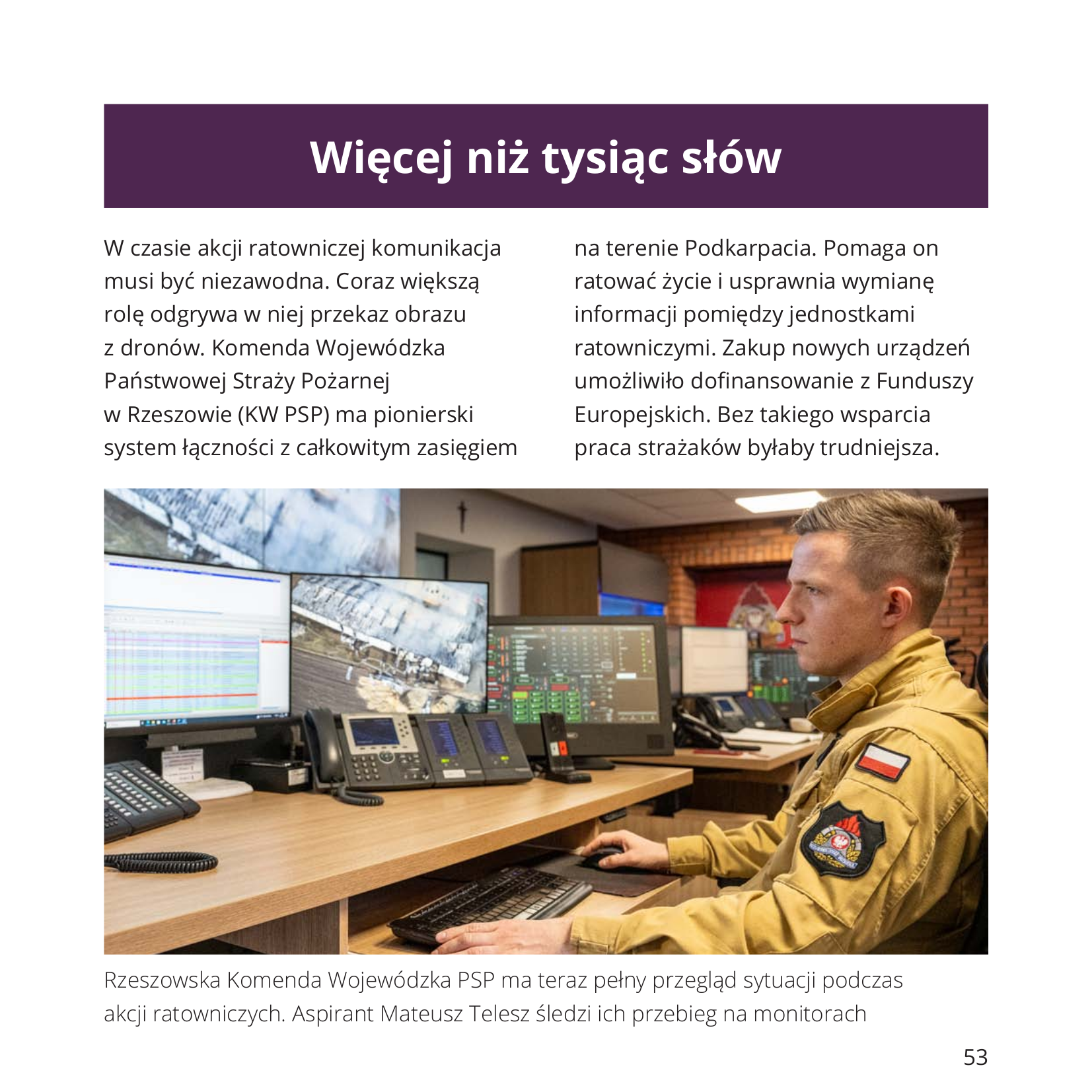 Jedna z tych historii odnosi się do projektu pn. „Rozbudowa systemu łączności Państwowej Straży Pożarnej województwa podkarpackiego dla potrzeb usprawnienia koordynacji działań ratowniczo-gaśniczych” współfinansowanego ze środków UE w ramach RPO WP realizowanego przez KW PSP w Rzeszowie w latach 2019-2023. Koszt realizacji projektu to niemal 15 mln zł. W ramach projektu nasze województwo uzyskało: