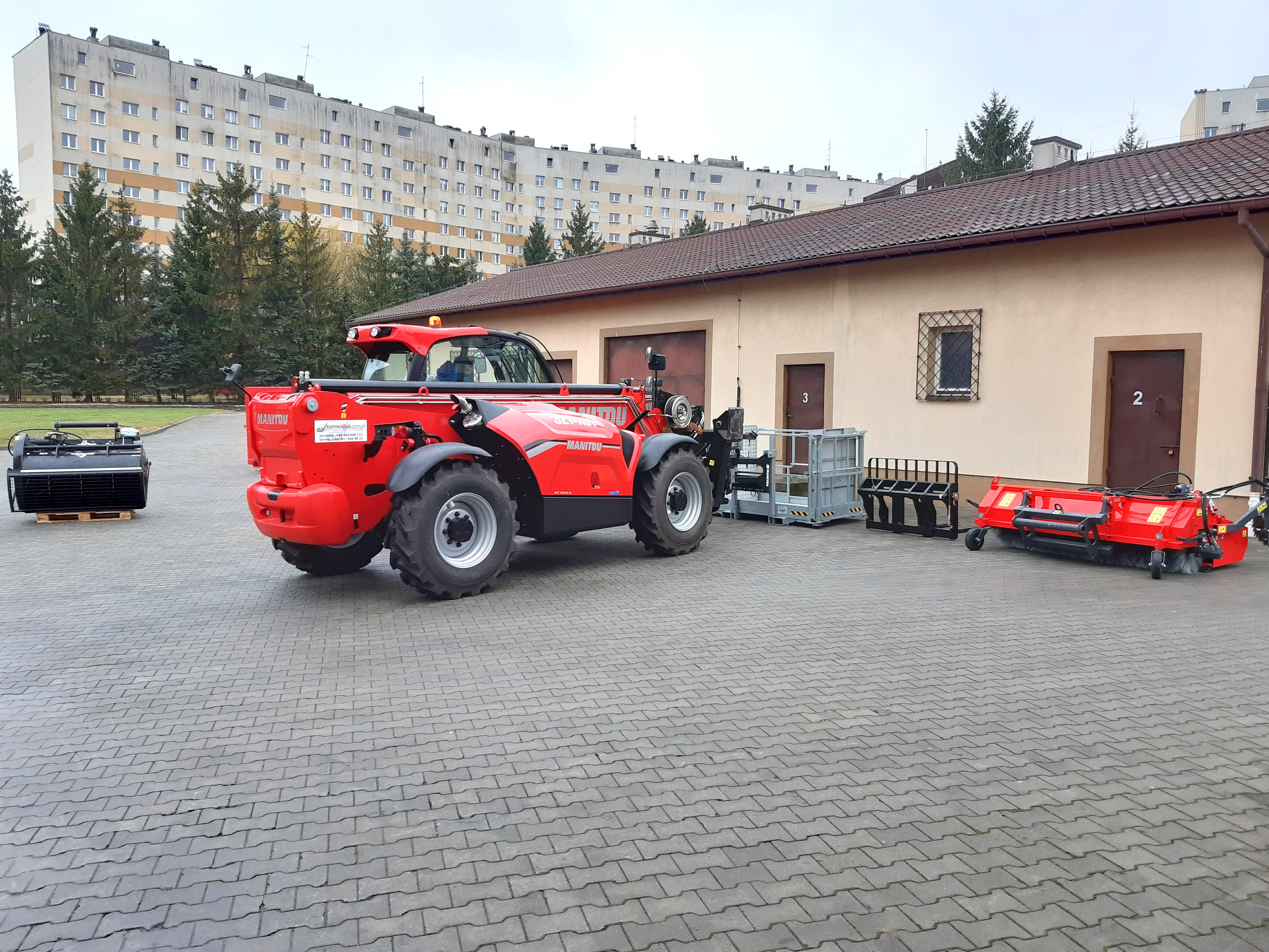 Dodatkowy osprzęt, w który Manitou jest wyposażony to: platforma robocza, widły pływające paletowe, szufla do materiałów sypkich, szufla mieszająca z funkcją napełniania worków, lemiesz do odśnieżania, szufla z zamiatarką oraz szczotką, szufla z chwytakiem hydraulicznym oraz widły z chwytakiem hydraulicznym.