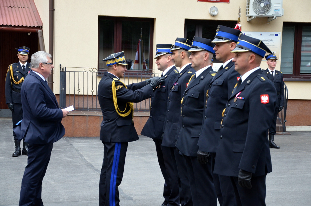 Uroczysty apel był okazją do wręczenia awansów na wyższe stopnie służbowe, medali i odznaczeń dla zasłużonych strażaków.