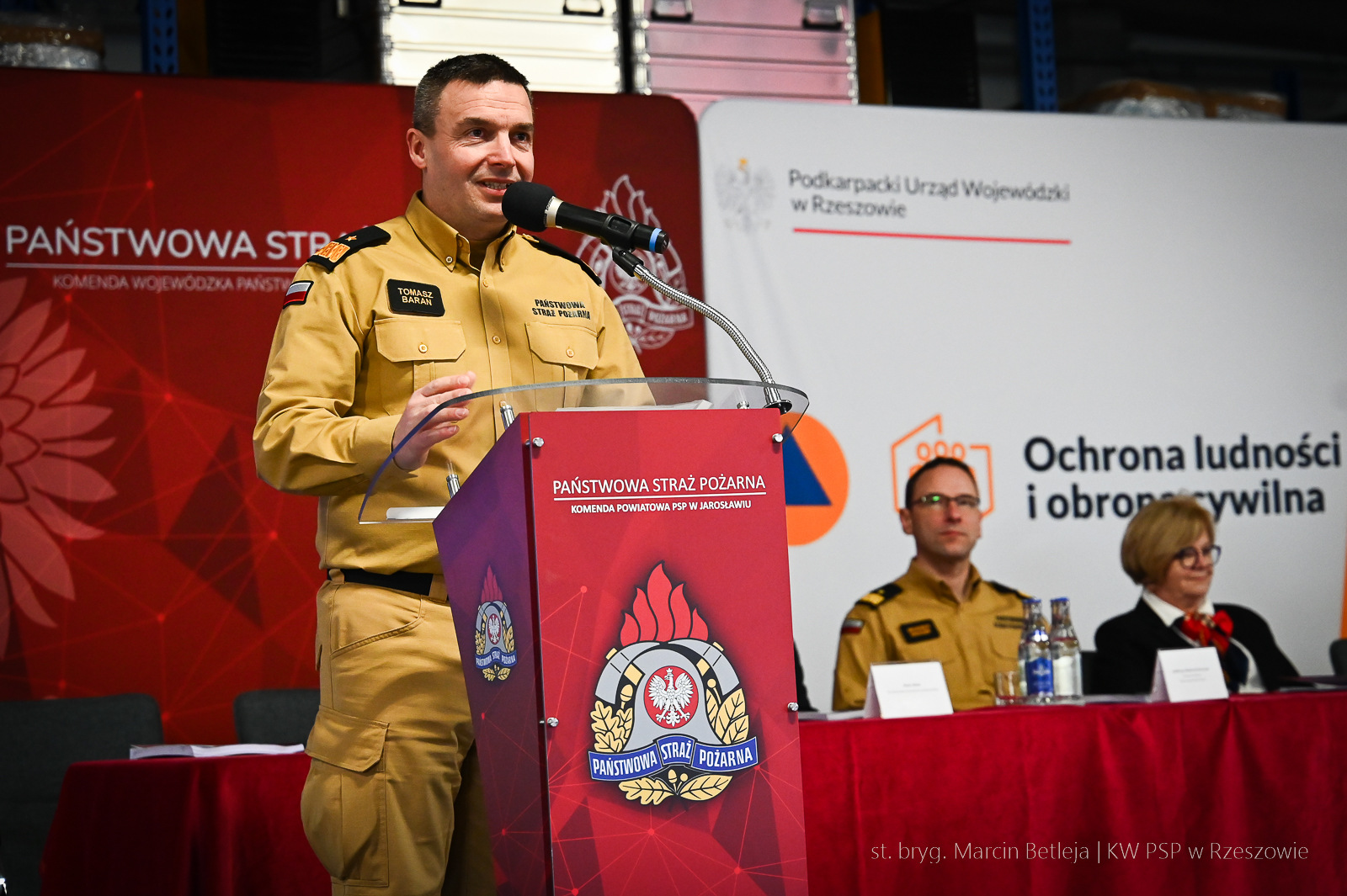 W środę, 11 lutego na placu wewnętrznym Komendy Powiatowej PSP w Jarosławiu odbyła się uroczysta zbiórka zorganizowana z okazji narady rocznej kadry kierowniczej Państwowej Straży Pożarnej woj. podkarpackiego, połączona z przekazaniem sprzętu oraz podsumowaniem realizacji programu Ochrony Ludności i Obrony Cywilnej (OLiOC) za 2025 r. Spotkanie stanowiło okazję do przedstawienia najważniejszych działań i wyzwań minionego roku, a także do podkreślenia roli PSP i OSP w budowaniu odporności społecznej oraz gotowości na sytuacje kryzysowe.