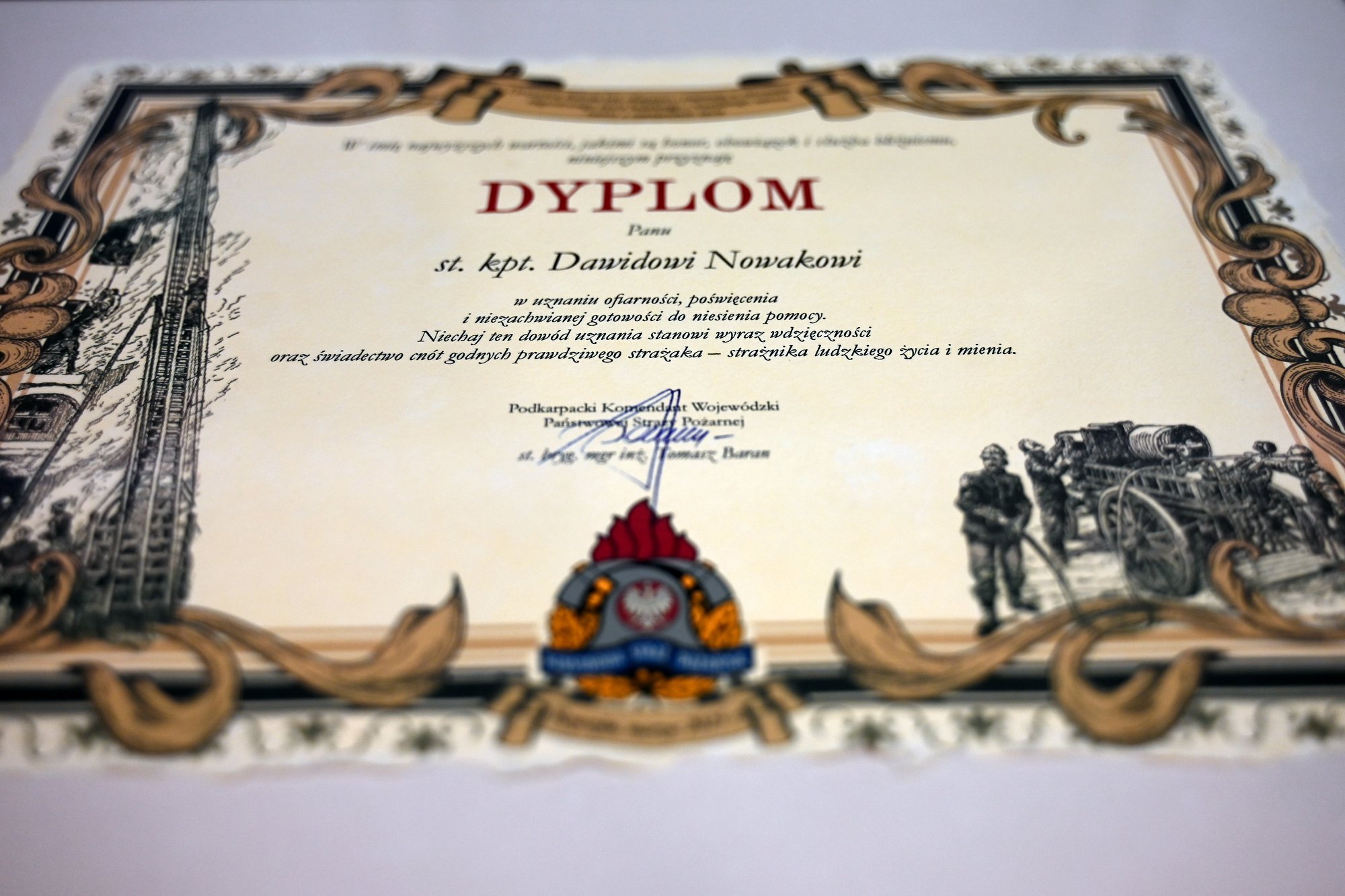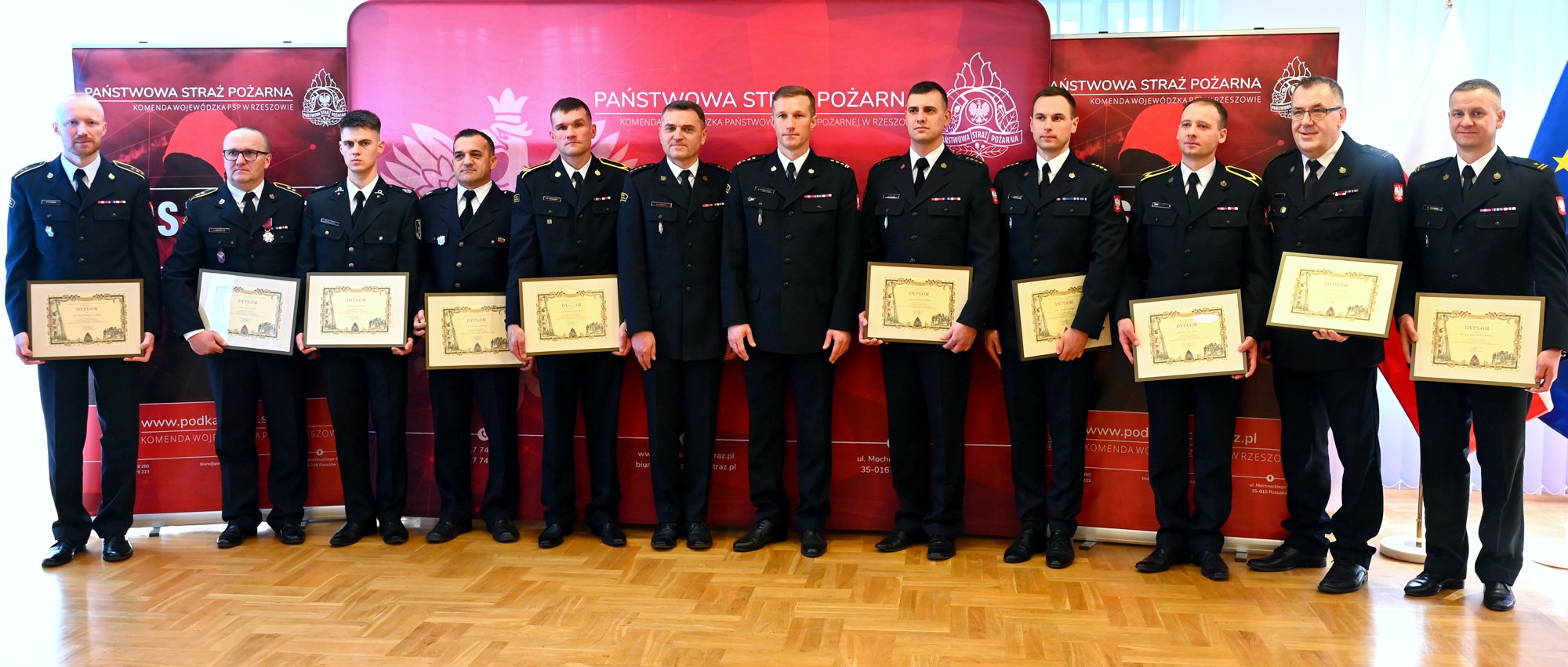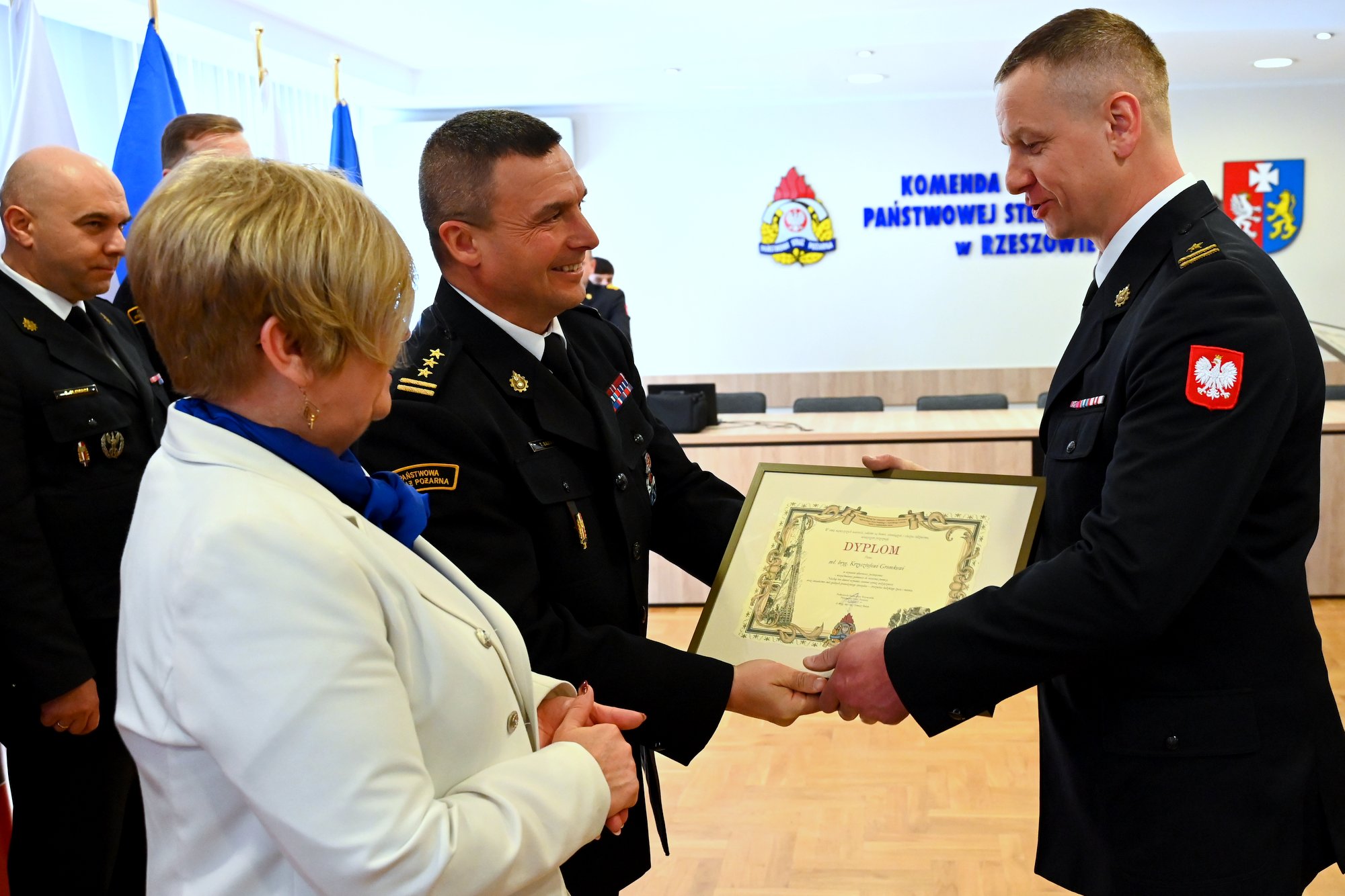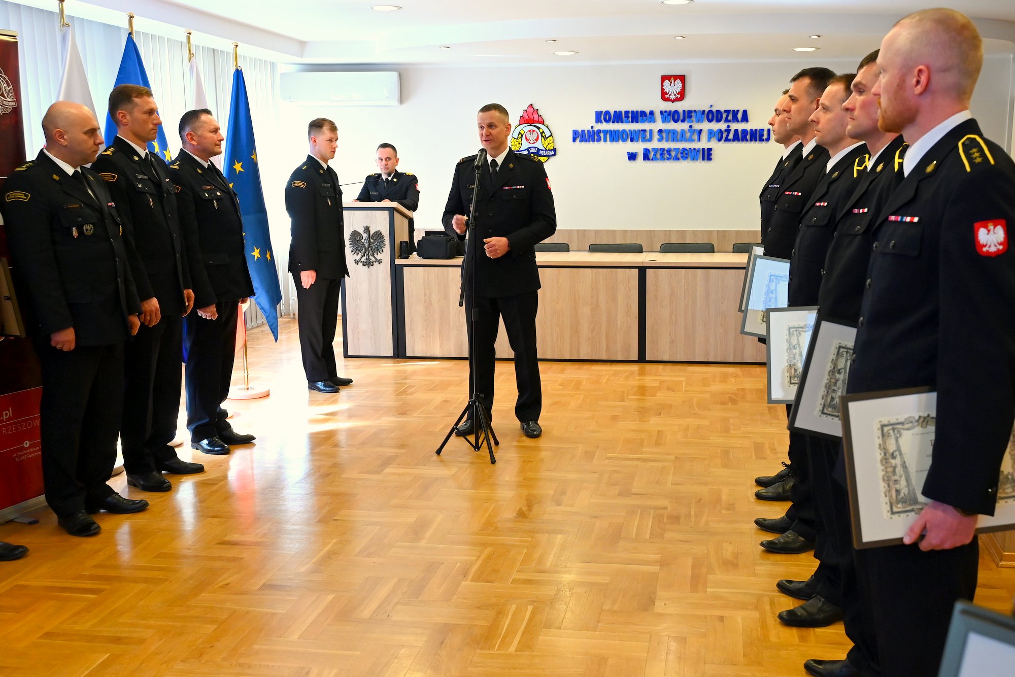 Podczas uroczystości podkarpacki komendant wojewódzki PSP st. bryg. Tomasz Baran wręczył wyróżnienia i dyplomy strażakom, którzy odegrali kluczową rolę w tej niezwykle trudnej i niebezpiecznej operacji.