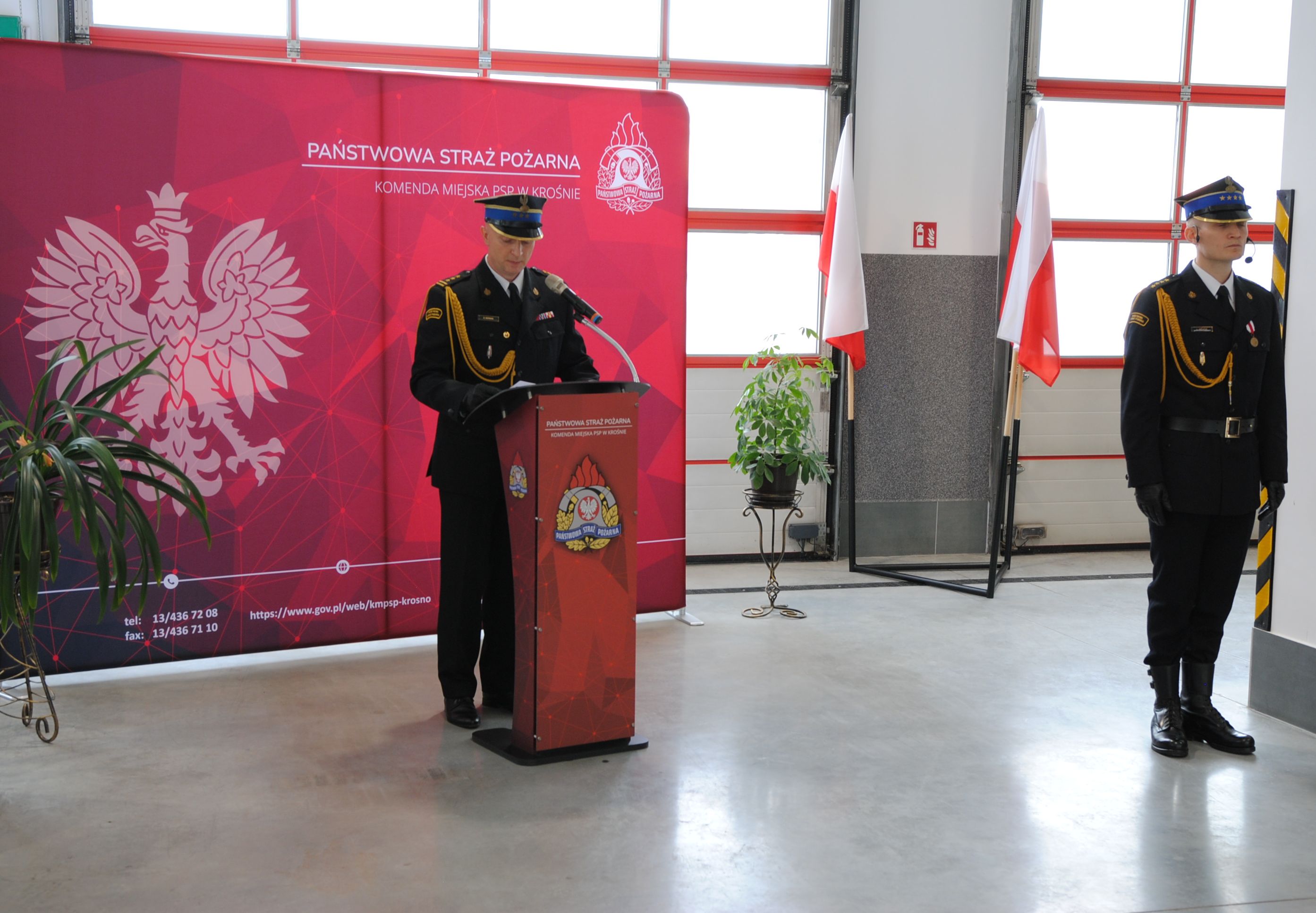 Po Mszy Świętej, w pomieszczeniu garażowym obiektu krośnieńskiej komendy, odbył się uroczysty apel. Meldunek od dowódcy uroczystości odebrał zastępca podkarpackiego komendanta wojewódzkiego PSP st. bryg. Grzegorz Oleniacz.