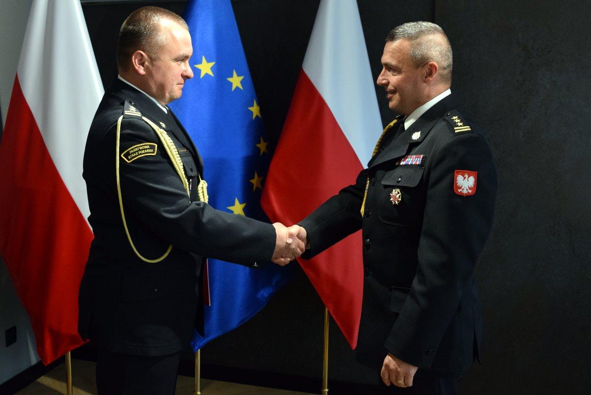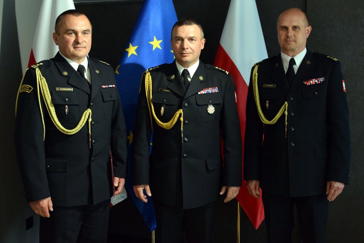 Zdjęcie zrobione wewnątrz pomieszczenia. Na zdjęciu trzech oficerów Państwowej Straży Pożarnej. Za nimi stoją biało-czerwone flagi oraz flaga UE.