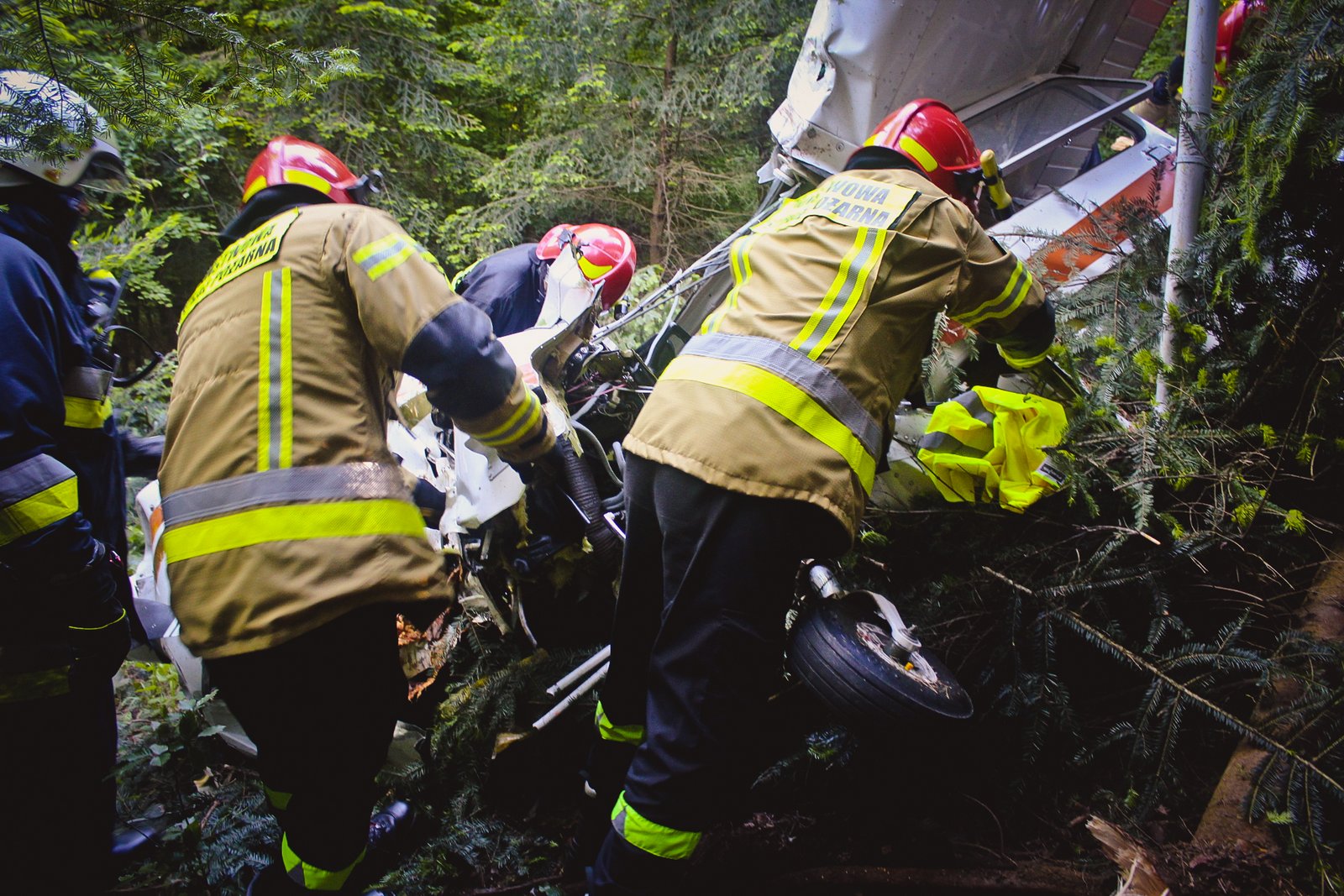 Działania strażaków polegały na zabezpieczeniu miejsca zdarzenia i usunięciu wycieku paliwa z wraku samolotu. W działania ratownicze zaangażowane były 4 zastępy straży pożarnych – 13 strażaków.