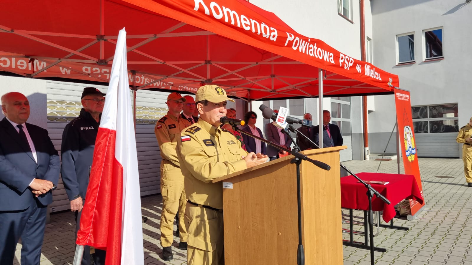 Przekazanie nastąpiło w formie podpisania protokołu przez komendanta powiatowego bryg. Łukasza Kapinosa oraz prezesa zarządu firmy BudPis Pana Pawła Piskora. Uroczysta zbiórka przebiegła w obecności funkcjonariuszy i pracowników cywilnych mieleckiej komendy oraz zaproszonych gości: posła na sejm RP Fryderyka Kapinosa, zastępcy podkarpackiego komendanta wojewódzkiego PSP st. bryg. Andrzeja Marczeni, członka prezydium Zarządu Głównego ZOSP RP druha Franciszka Augustyna, starosty powiatu mieleckiego Stanisława Lonczaka, burmistrz gminy Przecław Renaty Siembab, wójta gminy Borowa Stanisława Mieszkowskiego, wójta gminy Czermin Sławomira Sidura, wójta gminy Mielec Józefa Piątka, wójta gminy Padew Narodowa Roberta Puty, wójta gminy Tuszów Narodowy Andrzeja Głaza, projektanta obiektu Grzegorza Pikora.