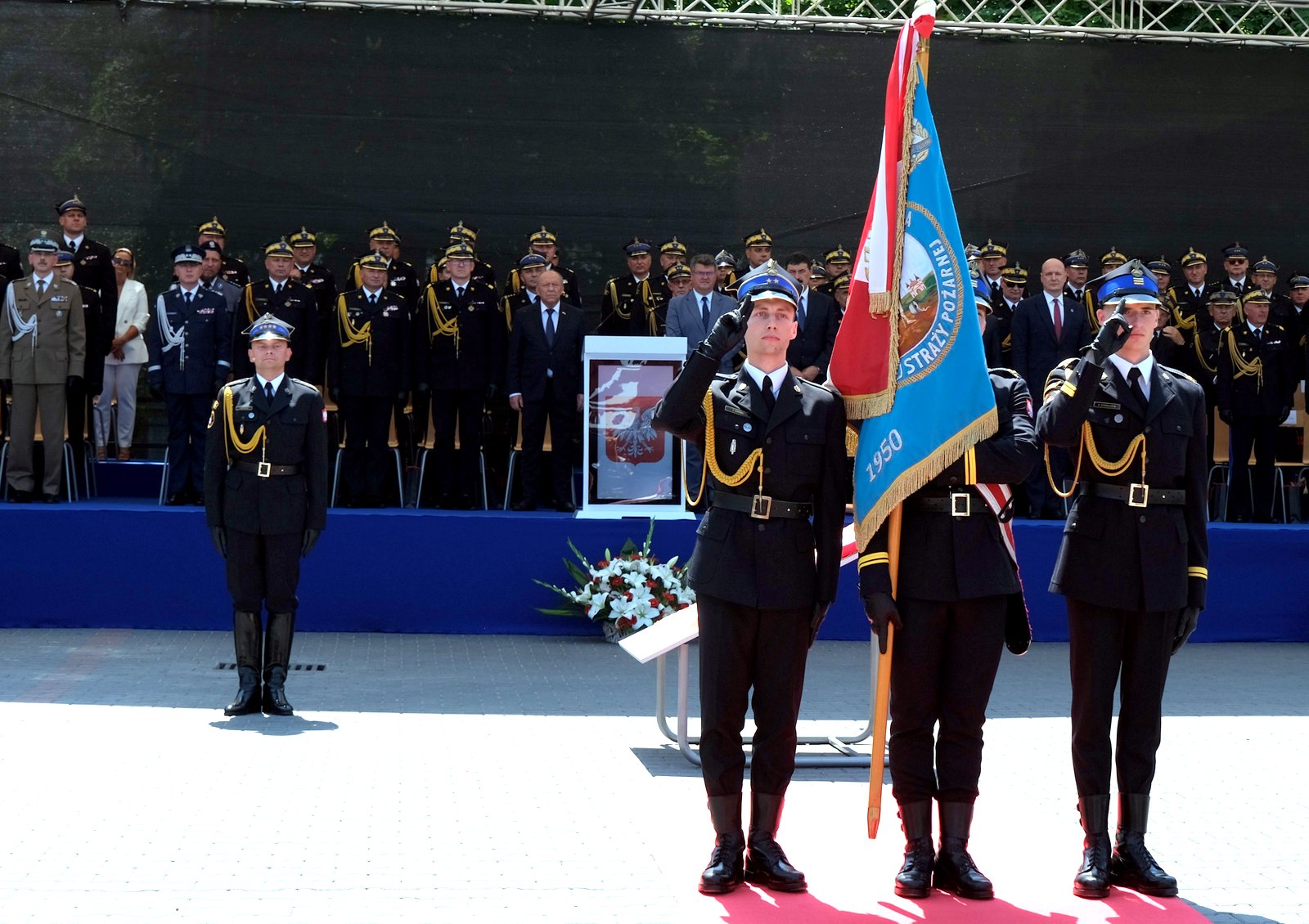 „Wręczam Komendzie Głównej Państwowej Straży Pożarnej sztandar ufundowany przez społeczeństwo i środowisko pożarnicze”.