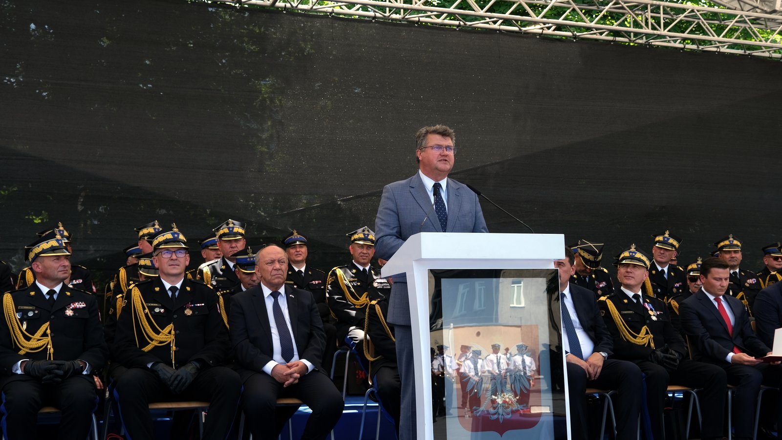 „W imieniu społecznego komitetu fundacji sztandaru dla Komendy Głównej Państwowej Straży Pożarnej przekazuję ufundowany sztandar w celu dokonania aktu wręczenia”.