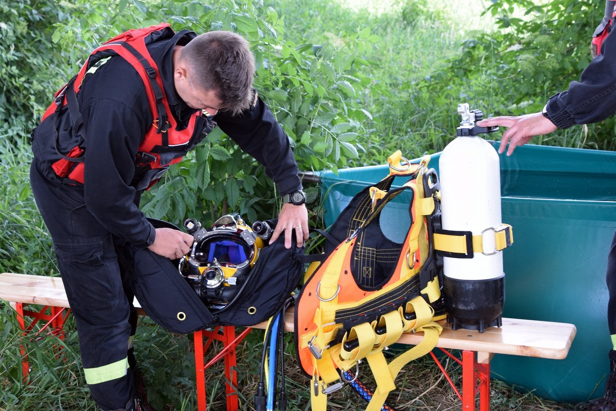 Strażacy nurkowie zapoznali się ze sprzętem przeznaczonym do nurkowania w wodach skażonych oraz sprzętem przeznaczonym do, niezbędnej podczas pracy w zanieczyszczonych zbiornikach, dekontaminacji.
