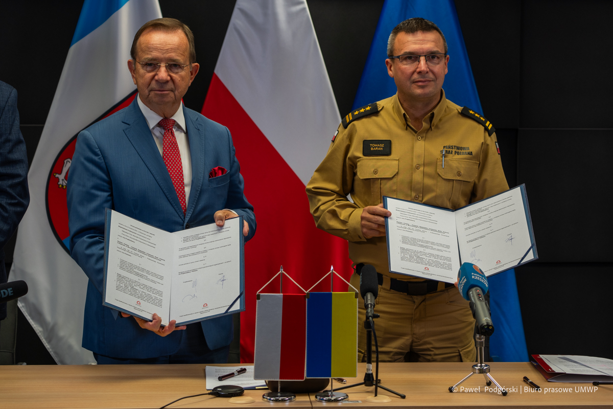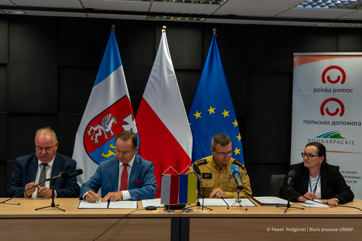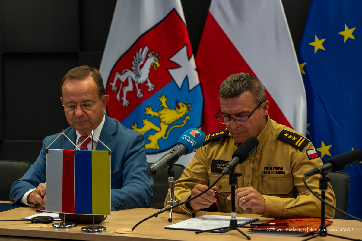 Na konferencji prasowej, zorganizowanej w Urzędzie Marszałkowskim w Rzeszowie, Marszałek Województwa Podkarpackiego Władysław Ortyl, wicemarszałek Piotr Pilch oraz Podkarpacki Komendant Wojewódzki Państwowej Straży Pożarnej st. bryg. mgr inż. Tomasz Baran, podpisali umowę dotyczącą wsparcia Państwowej Służby ds. Sytuacji Nadzwyczajnych Ukrainy w Obwodzie Iwano-Frankiwskim.