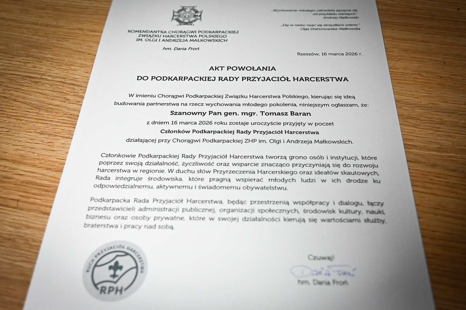 Akt powołania, wręczony przez komendantkę Chorągiew Podkarpacka ZHP hm. Darię Froń, to nie tylko wyraz uznania dla dotychczasowej działalności nadbrygadiera Barana, ale przede wszystkim symbol zacieśniania współpracy na rzecz rozwoju harcerstwa w naszym regionie.