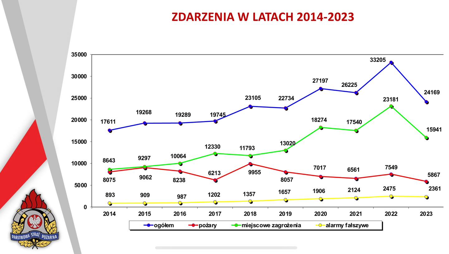 W 2023 roku na terenie województwa zachodniopomorskiego doszło do 24 169 zdarzeń, co stanowi spadek do roku poprzedniego o 27,21%, w tym 5 876 pożarów, 15 941 miejscowych zagrożeń oraz 2 361 alarmów fałszywych.