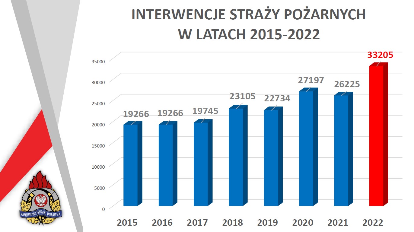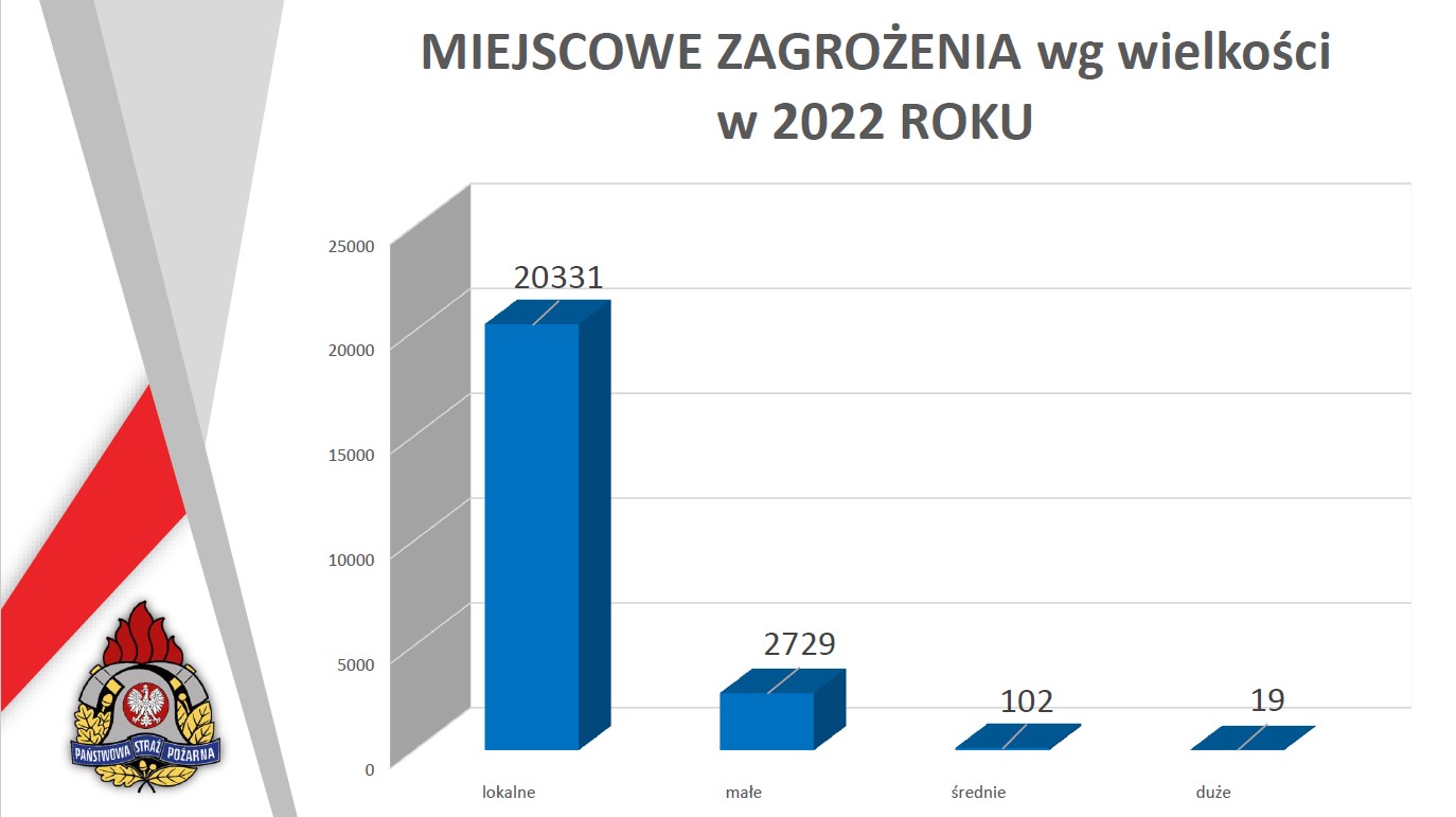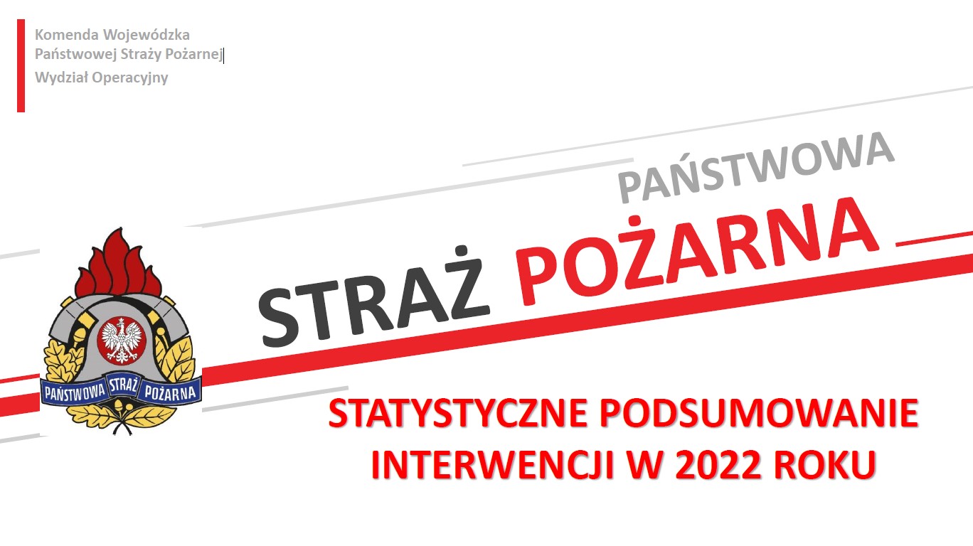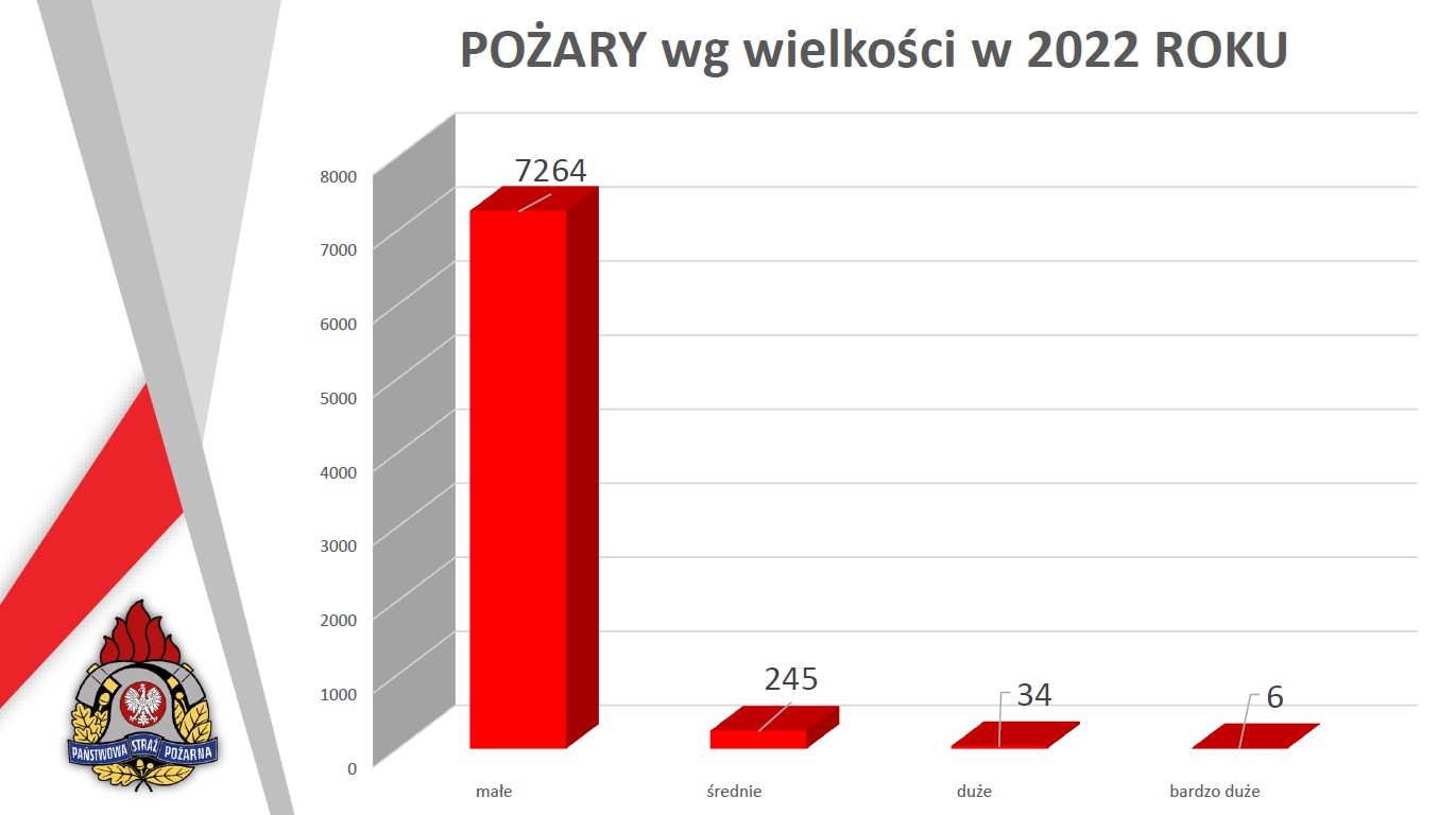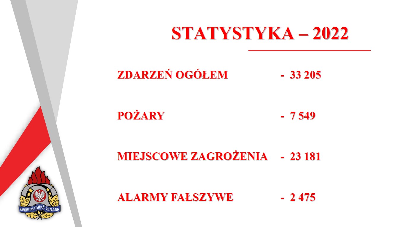 W ubiegłym roku miało miejsce ogółem: 7549 pożarów, 23 181 miejscowych zagrożeń oraz 2 475 alarmów fałszywych. Przez cały 2022 rok powstało 1370 pożarów w obiektach mieszkalnych, w wyniku których 13 osób straciło życie, a 124 odniosło obrażenia.
