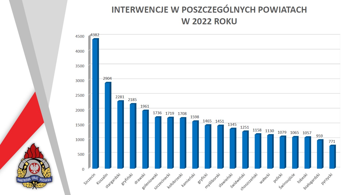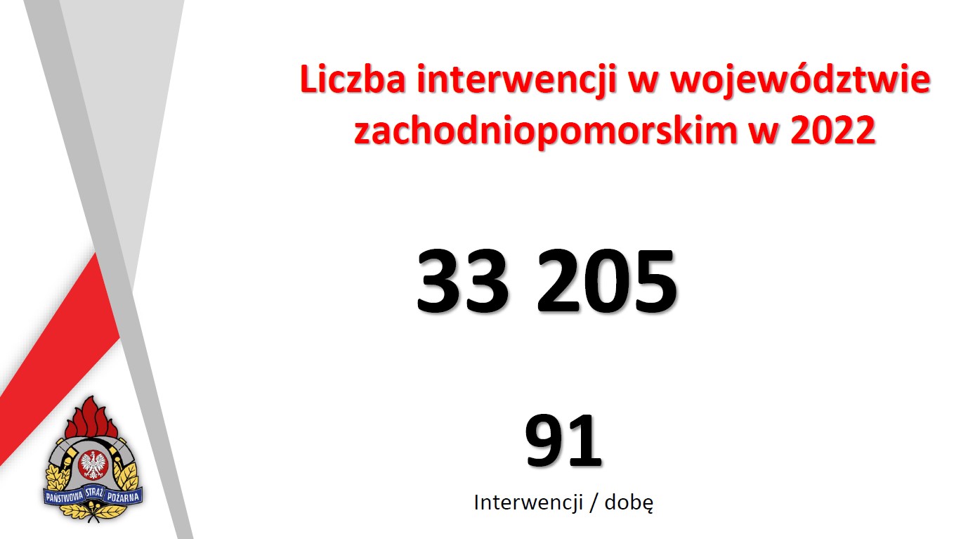 W 2022 roku odnotowano 33 205 interwencji, co stanowi największą liczbą zdarzeń w historii PSP województwa zachodniopomorskiego. W stosunku do roku 2021 było to o 6980 interwencji więcej. Strażacy interweniowali 68% częściej niż pięć lat temu, kiedy odnotowano 19 745 zdarzeń.