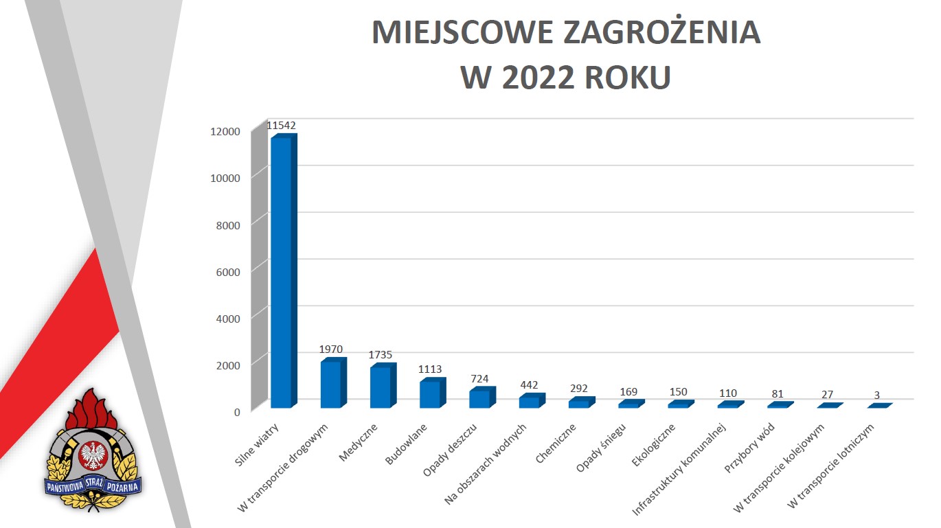 W minionym roku strażacy najczęściej interweniowali przy usuwaniu skutków zdarzeń atmosferycznych, w tym silnego wiatru -11 542, opadów deszczu - 742, opadów śniegu - 169 oraz przyborów wód w rzekach - 81.