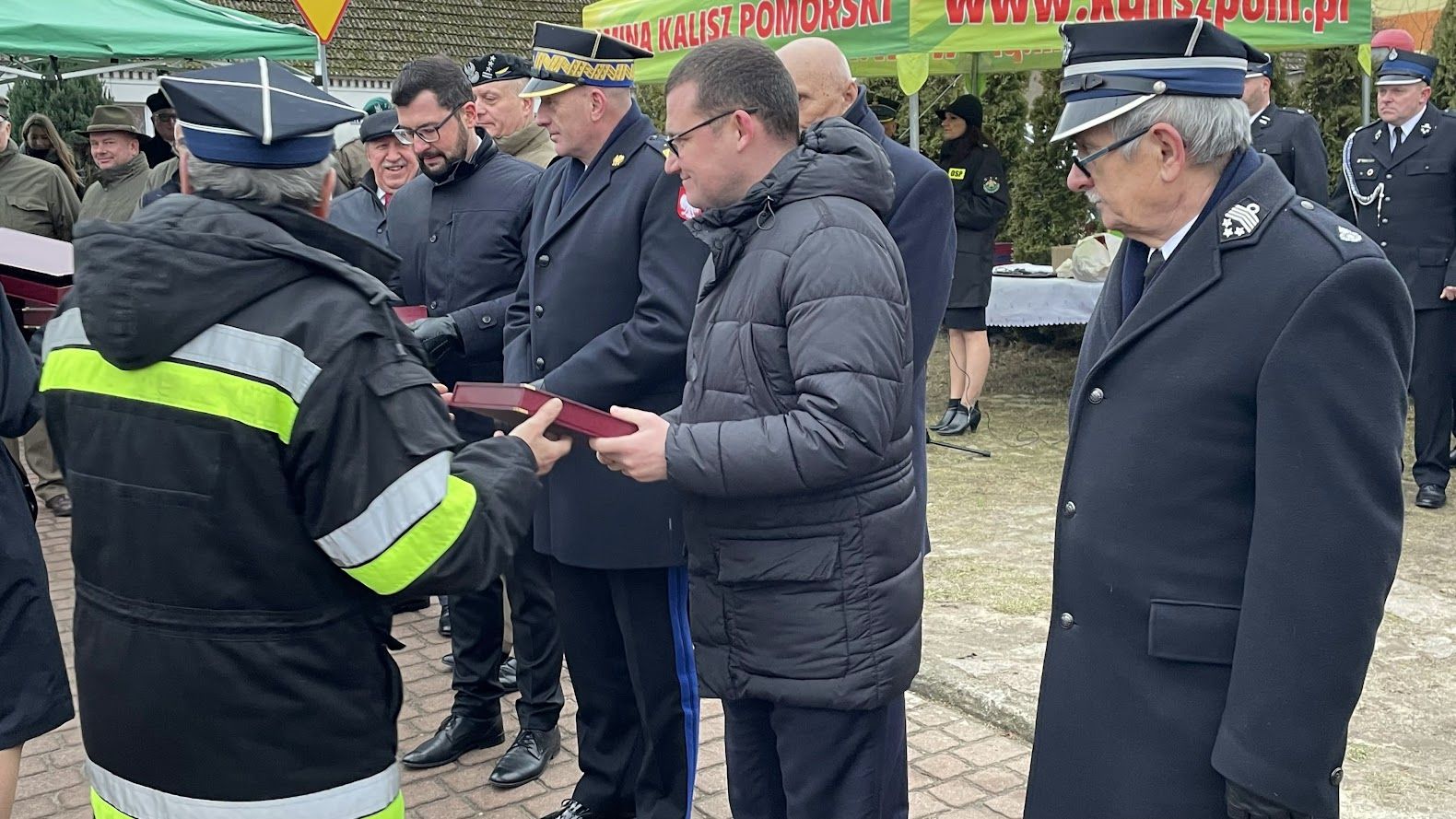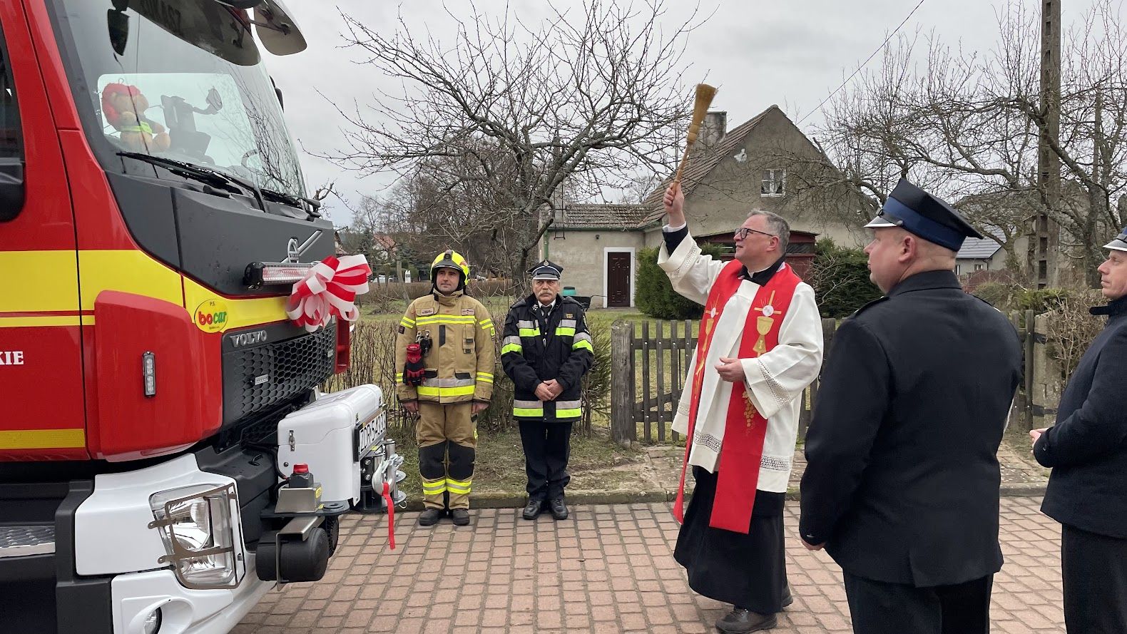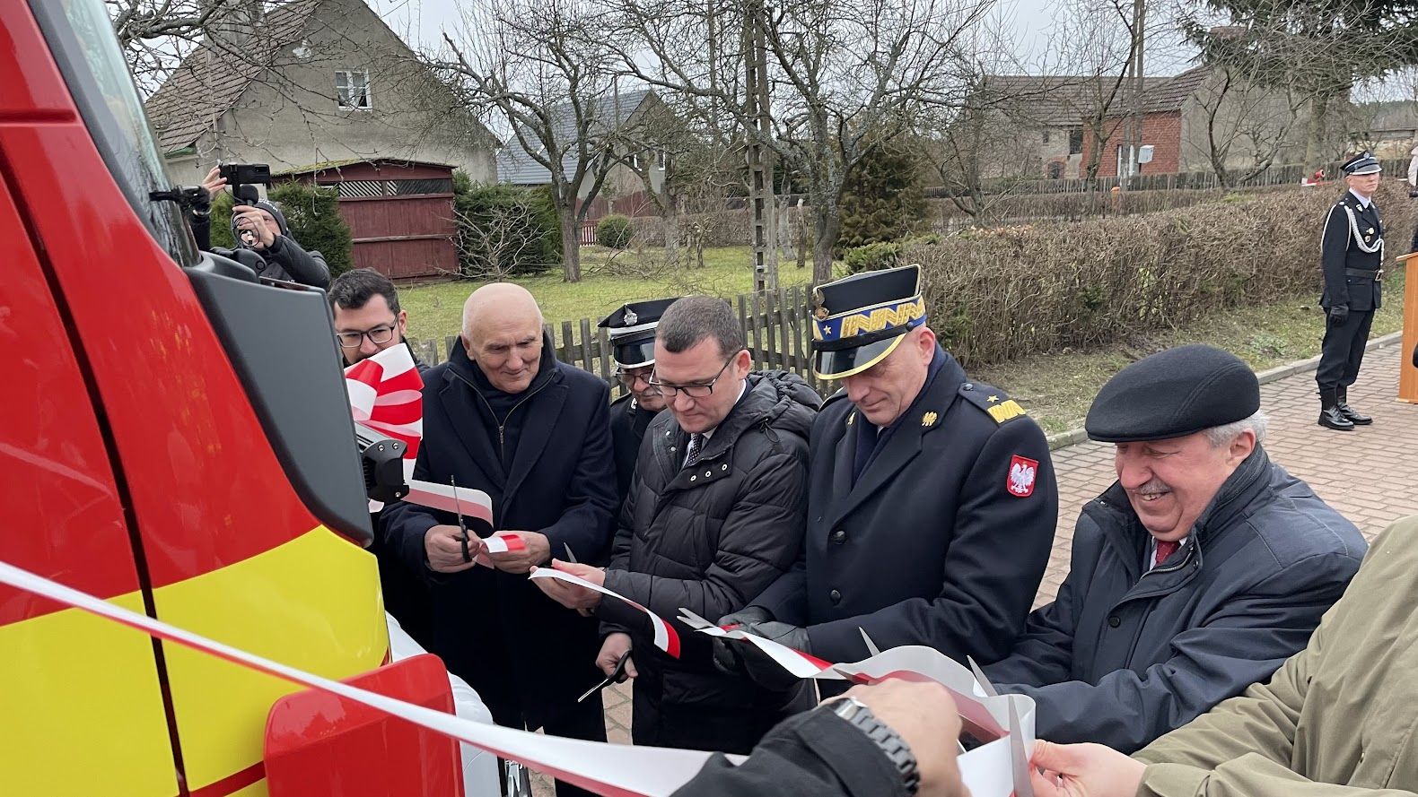 Strażacy ochotnicy z OSP Poźrzadło Wielkie w gminie Kalisz Pomorski z nowym wozem gaśniczym