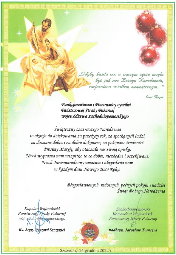 Życzenia Zachodniopomorskiego Komendanta Wojewódzkiego PSP z okazji świąt Bożego Narodzenia 2022 22.12.2022 Materiały 2022_Boże Narodzenie_życzenia KW PSP 2022_Boże_Narodzenie_życzenia_KW_PSP.pdf 0.11MB Zdjęcia (1) Pokaż zdjęcie 1 z galerii.