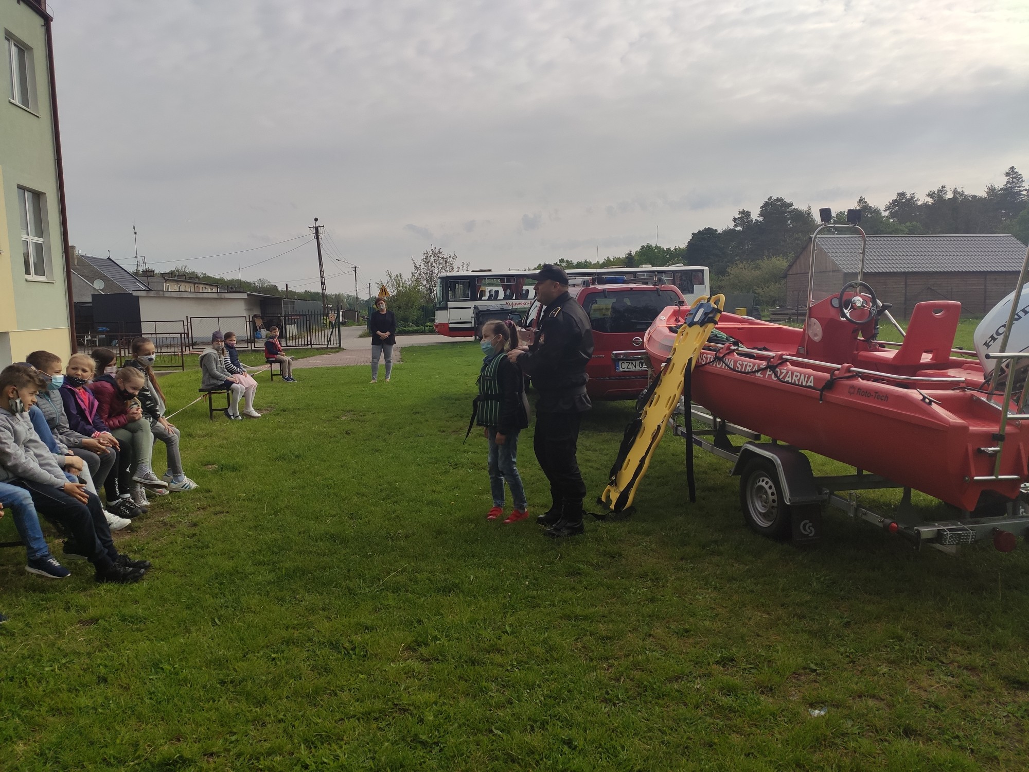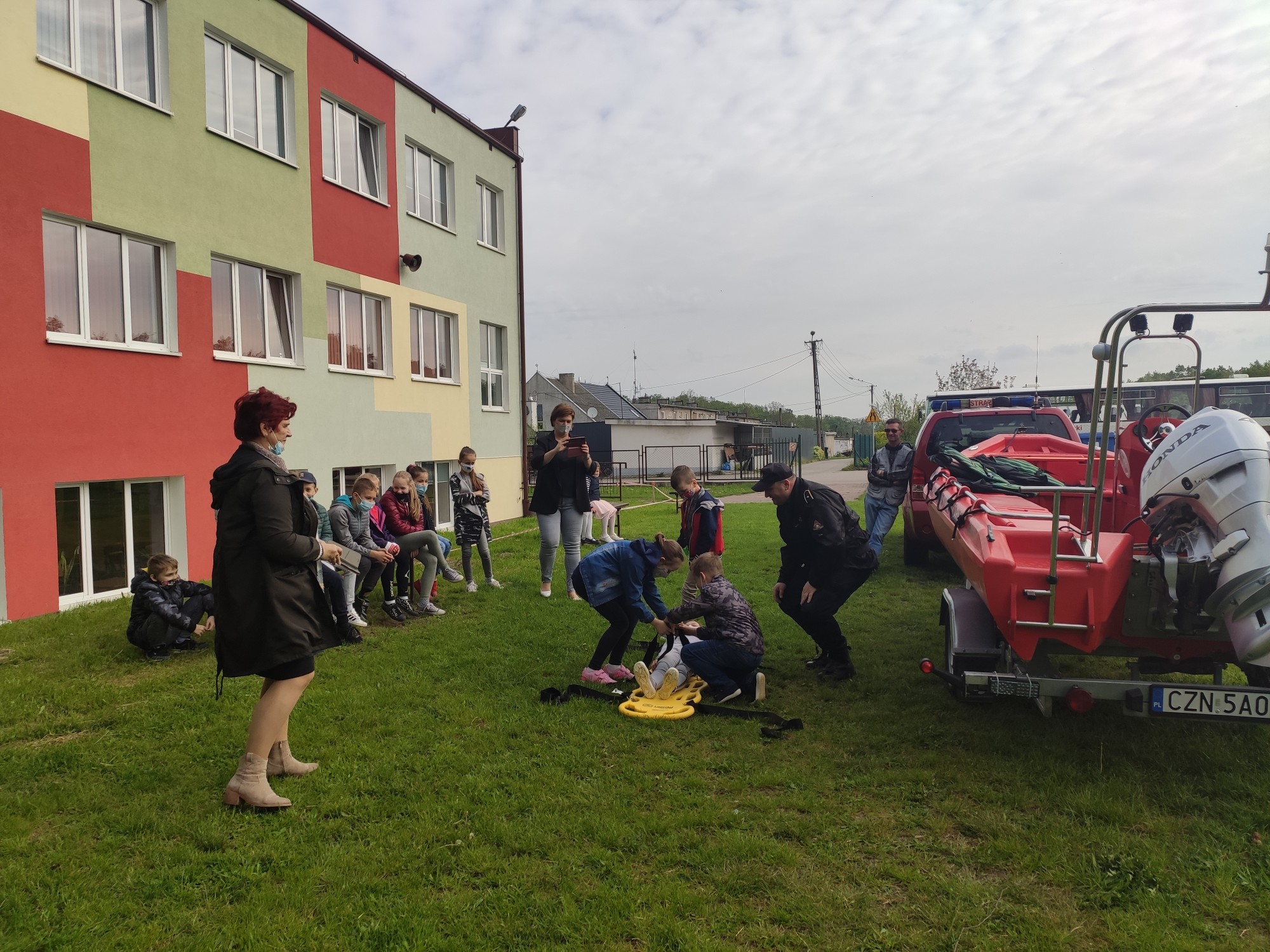 Strażacy zaprezentowali łódź ratowniczą KONTRA, będącej na stanie Jednostki Ratowniczo – Gaśniczej w Żninie oraz jej wyposażenie. Dzieci miały możliwość przymierzenia kamizelek ratunkowych oraz zapoznania się z sprzętem ratowniczym.