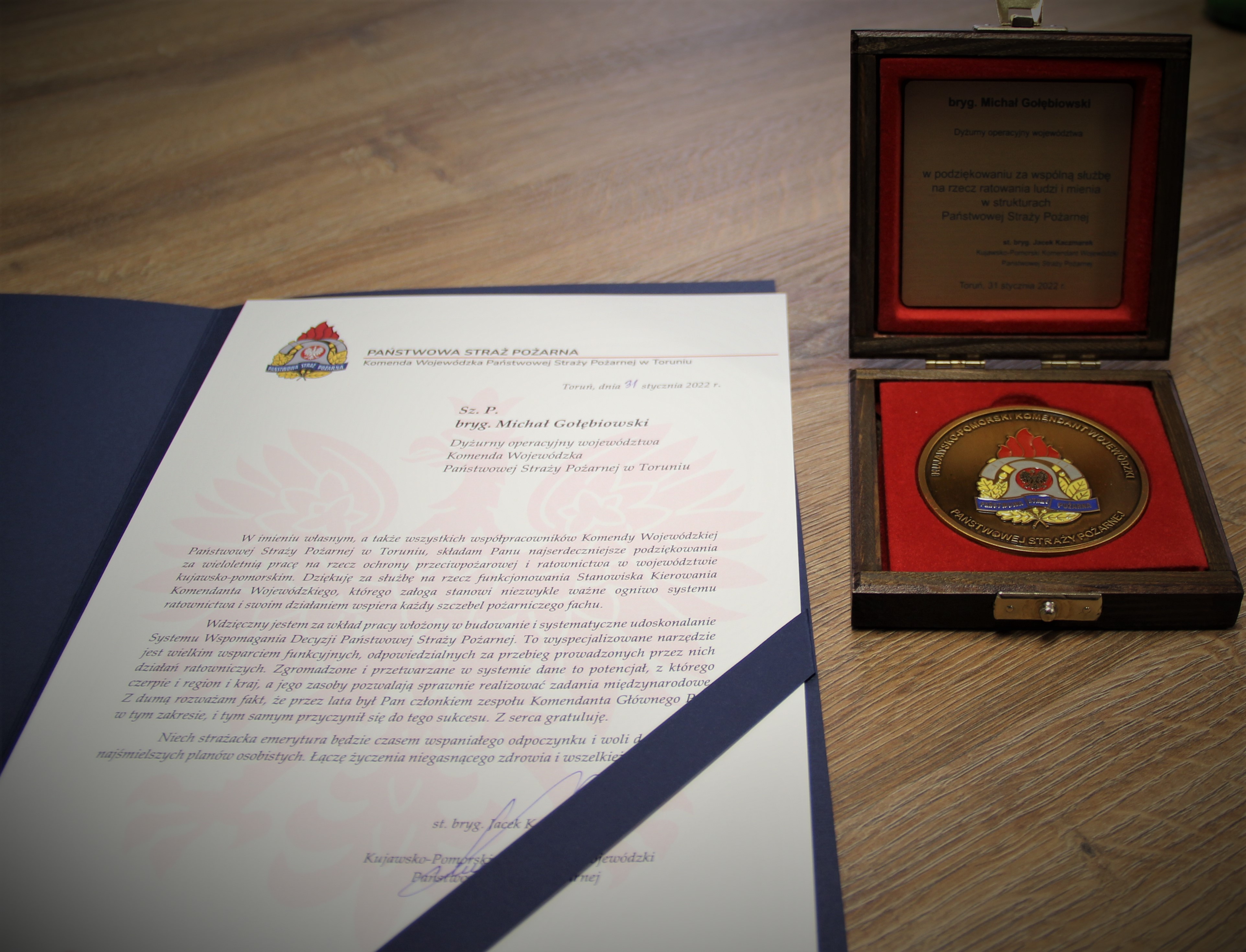 Z dniem 31 stycznia 2022 roku swą służbę w Państwowej Straży Pożarnej zakończył Dyżurny Operacyjny Województwa bryg. Michał Gołębiowski. 7 lutego Kujawsko-Pomorski Komendant Wojewódzki Państwowej Straży Pożarnej st. bryg. Jacek Kaczmarek w obecności swojego zastępcy st. bryg. Roberta Wiśniewskiego złożył mu podziękowania za służbę oraz wręczył decyzję o zwolnieniu ze służby. Korzystając z okoliczności i podniosłego charakteru spotkania Komendant przekazał bryg. Gołębiowskiemu nagrodę Komendanta Głównego PSP oraz wręczył medal okolicznościowy Komendanta Wojewódzkiego PSP w Toruniu.