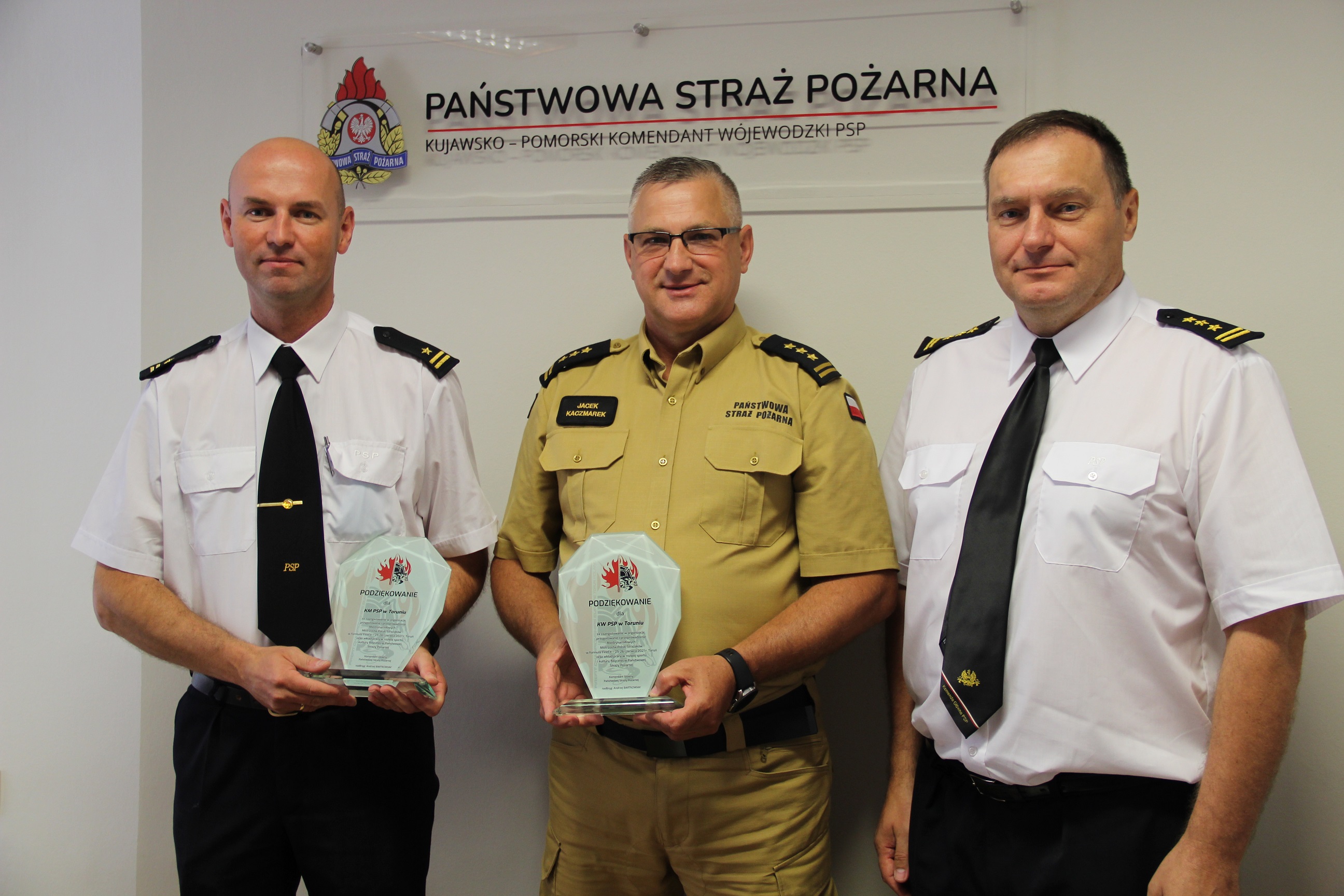 Takie same podziękowania i gratulacje komendant główny skierował na ręce Komendanta Miejskiego PSP w Toruniu, które odebrał Zastępca mł. bryg. Sławomir Grudziński, bowiem to waśnie załoga KM PSP w Toruniu jest gospodarzem tych spektakularnych rozgrywek już od ponad dekady.