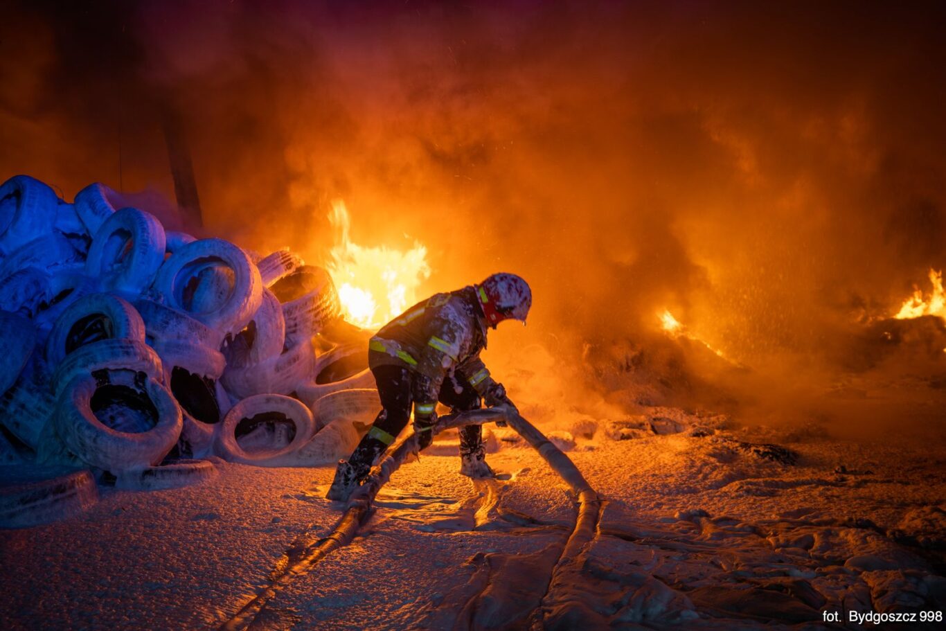 W piątek 13 listopada o godzinie 17:28 do Państwowej Straży Pożarnej wpłynęło zgłoszenie o pożarze składowiska opon w Raciniewie. Po dojeździe na miejsce zdarzenia strażacy zastali pożar w fazie rozwiniętej. Natychmiast dysponowano kolejne siły i środki spoza powiatu oraz grupę operacyjną kujawsko-pomorskiego komendanta wojewódzkiego PSP. Wraz z grupą operacyjną na miejsce akcji przybył Zastępca Kujawsko-Pomorskiego Komendanta Wojewódzkiego Państwowej Straży Pożarnej st. bryg. Robert Wiśniewski, który przejął dowodzenie akcją.