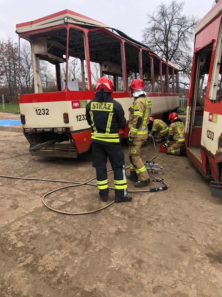 Dzięki uprzejmości firmy: „FHU Kawałek” z Lubicza, toruńscy strażacy mieli możliwość przeprowadzenia ćwiczeń praktycznych z wykonywania dostępu do osób poszkodowanych do wnętrza tramwajów jak i dostępu do poszkodowanych pod tramwajem.