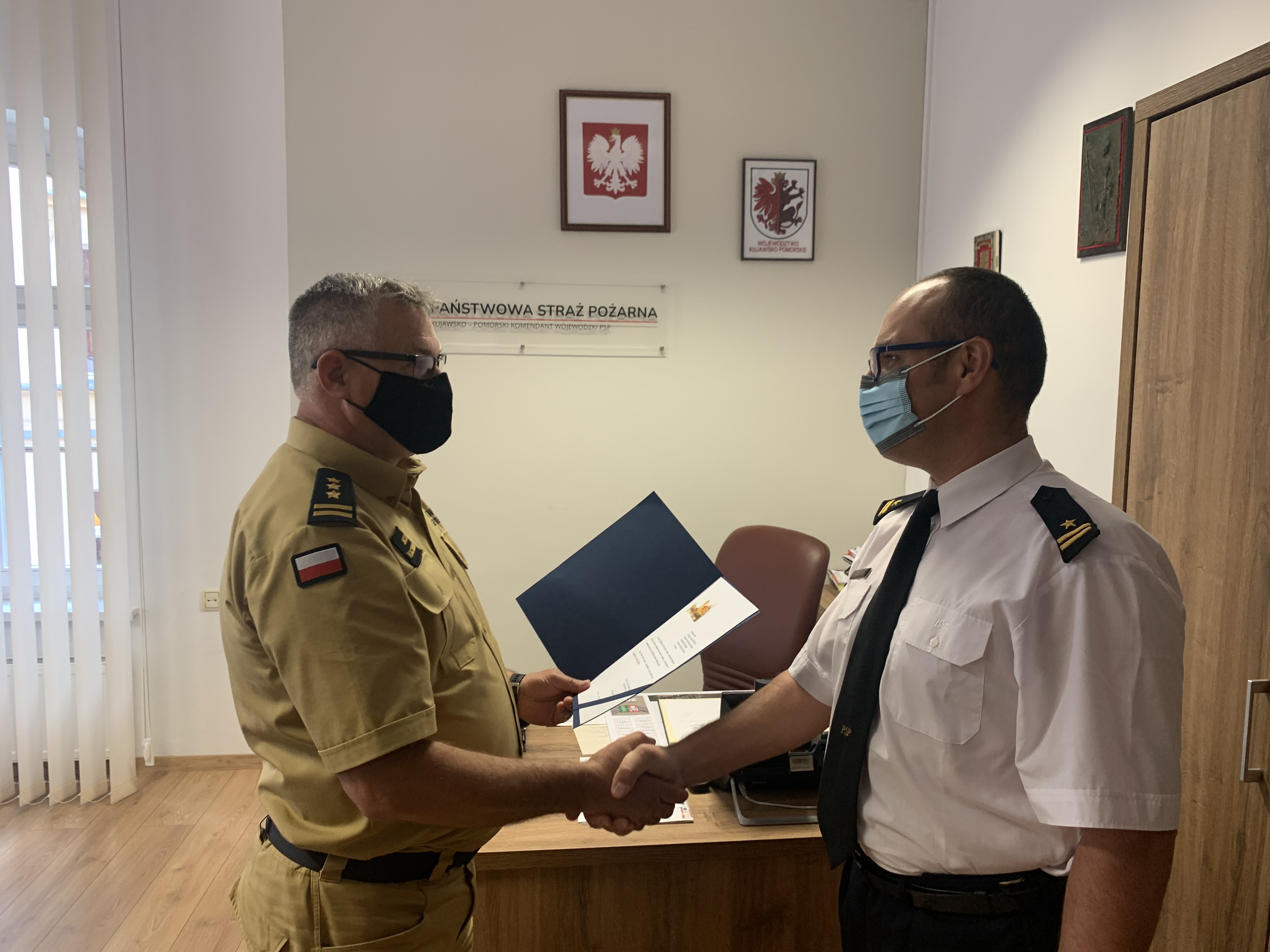 Zastępca Naczelnika Wydziału Organizacji i Nadzoru KW PSP w Toruniu mł. bryg. Artur Kiestrzyn odebrał z rąk Kujawsko-Pomorskiego Komendanta Wojewódzkiego PSP st. bryg. Jacka Kaczmarka podziękowania oraz nagrodę jubileuszową za 25 lat służby i pracy.